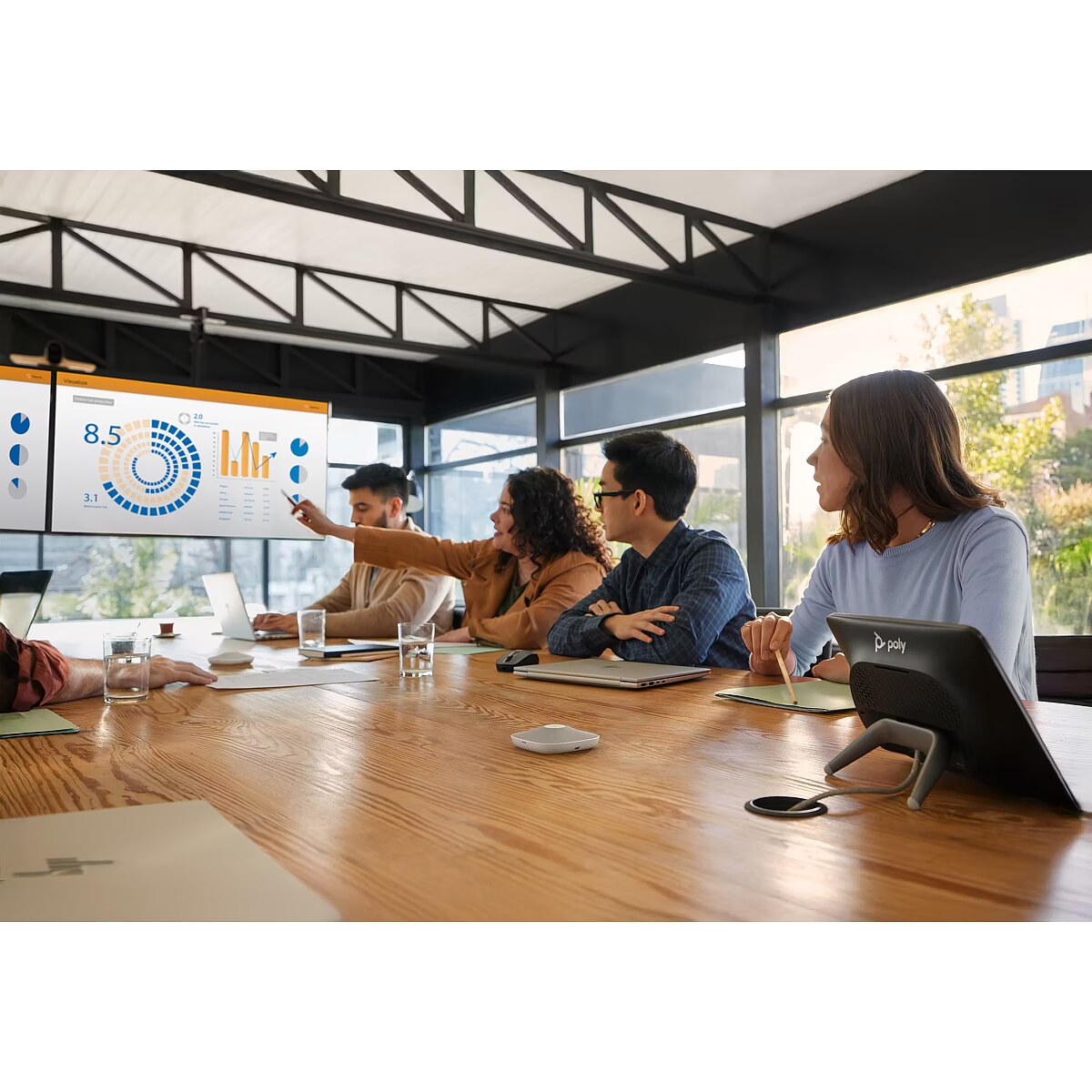 Features - Compatible products - Poly Studio G62: up to 8 Studio A2 table microphones; Poly Studio X72 and Poly Studio V72: up to 4 Studio A2 table microphones; Poly Studio X52 and Poly Studio V52: up to 4 Studio A2 table microphones; Poly Studio X32: up to 2 Studio A2 table microphones; Poly Studio V12: only 1 Studio A2 table microphone.