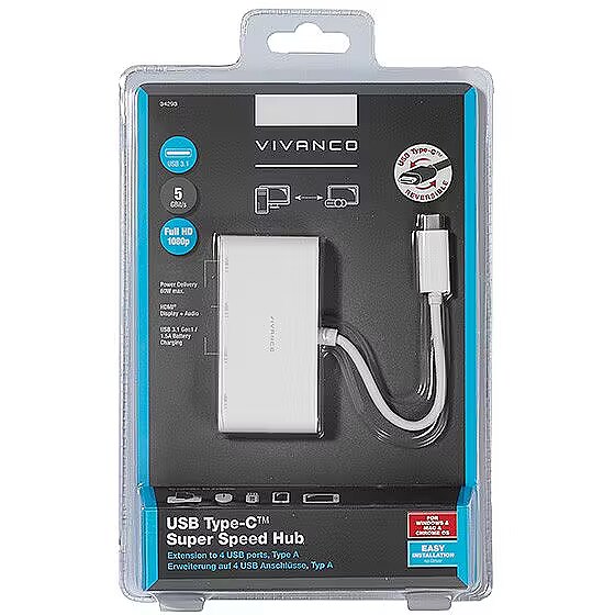 description_ru - Принтер, сканер, камера или клавиатура – с USB-хабом Vivanco USB-C можно подключить их все одновременно. Этот хаб позволяет подключить к Вашему устройству с разъемом USB-C до четырех устройств, обеспечивая благодаря USB 3.1 Gen 1 быструю передачу данных скоростью до 5 Гбпс. Штекер USB-C Разъемы USB 3.1 Gen 1 Быстрая скорость передачи данных: 5 Гбит/с Длина кабеля: 10 см Подходящие операционные системы: Windows 10 / 8 / 7; Mac OS 10.6 или новее; Google Chrome OS