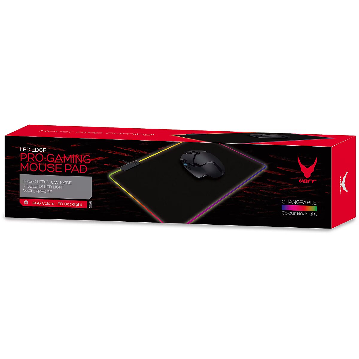LongDesc - The mouse pad with RGB LED backlight is a functional solution which is necessary in every gamer's room.BETTER PRECISIONThe pad was made of a separate material, which allows for convenient and smooth operations with optical and laser mice. The anti-slip rubber from which the bottom of the pad was made guarantees stability even during the most demanding games.RGB LIGHTINGOn all edges of the pad, there is an LED backlight, which in no way affects the flexibility of the pad. The user can choose from as many as 7 different colours and their mixing mode (Magic LED show). The power pad (computer or USB charger) is connected using a standard Micro USB cable.OBLIGATORY ON THE GAMER’S DESKElegant black, edged edges and RGB backlight perfectly harmonizes with gaming accessories, including Varr brand.