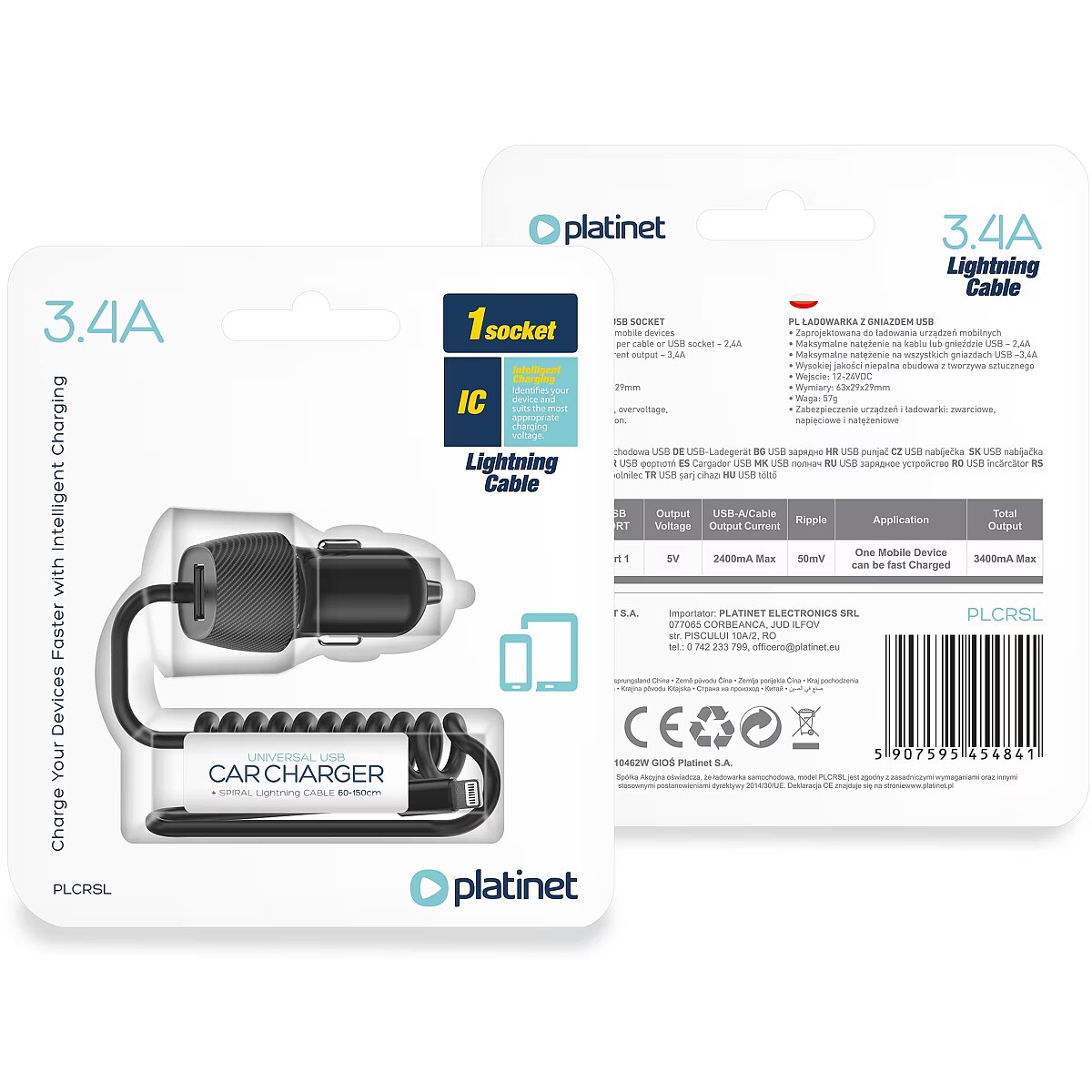 description_en - Platinet 3.4A USB-A + Lightning car power adapter has an output of up to 3.4 A of power, which allows you to quickly and efficiently charge your smartphone, tablet, GPS devices, etc. In addition to the USB connection, the car charger also has a Lightning connection with a spiral cable, which also allows you to charge Apple devices. The power adapter has both short-circuit and overcurrent protection and it is safe to use. 3.4 A output current USB-A + Lightning connection Special spiral cable Short circuit and overcurrent protection Compact design Dimensions: 63 × 29 × 29 mm Weight: 57 g