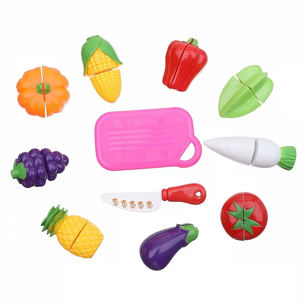 Description - Fruits and vegetables to play with Pretty, realistic fruit and vegetables. Each product is an excellent reproduction of real fruit and vegetables, making play even more attractive. The products are made of pleasant-to-touch, high-quality plastic. They can be washed and are safe for children. Ideal for playing restaurant, cooking, home. Playing will help encourage your child to eat healthily. It is also an excellent exercise for small motor skills. Fruits and vegetables can be 'cut' with the included safe plastic knife and then connected as they have Velcro. The game develops imagination and creativity.