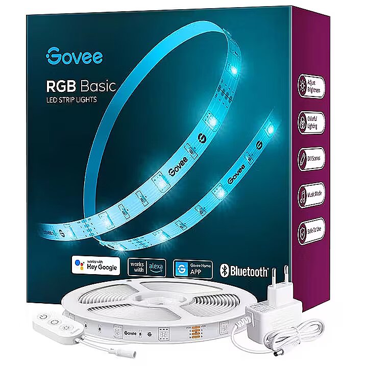 LongSummaryDescription - Govee RGB LED Stripe Basic. Type: Smart strip light, Interface: Wi-Fi/Bluetooth, Product colour: White. Mobile operating systems supported: Android, iOS. Energy efficiency class: G, Power consumption (typical): 12 W. Length: 5000 mm. Quantity per pack: 1 pc(s)