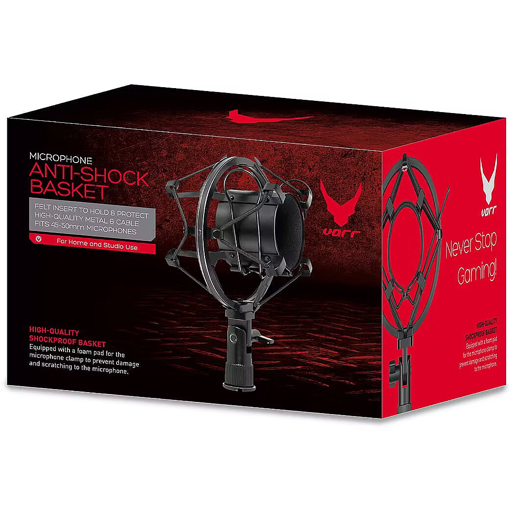 LongSummaryDescription - Varr Gaming Shockproof Basket for Microphones, Fits microphones of 45-50mm diameter, Mounting 5/8" thread, Angle adjustment with locking screw, Note Microphone not included2. Product type: Microphone shock mount, Brand compatibility: Any brand, Product colour: Black