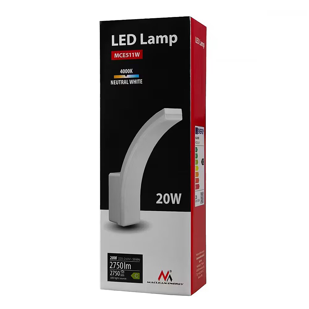 Other features - - Manufacturer: Maclean - Model: MCE511 W - Dimensions: 25 cm (height), 18.8 cm (width), 6.6 cm (depth) - Color: white - Voltage: 220-240 V/AC - Power frequency: 50/60 Hz - Power: 20W - Energy class: C - Luminous flux: 2750lm - Color temperature: 4000K (neutral white) - Protection class: IP65 - Material of construction: plastic - Lifetime: 25000 hours - Illumination angle: 120° - Minimum distance of light source from illuminated objects: 0,5 m