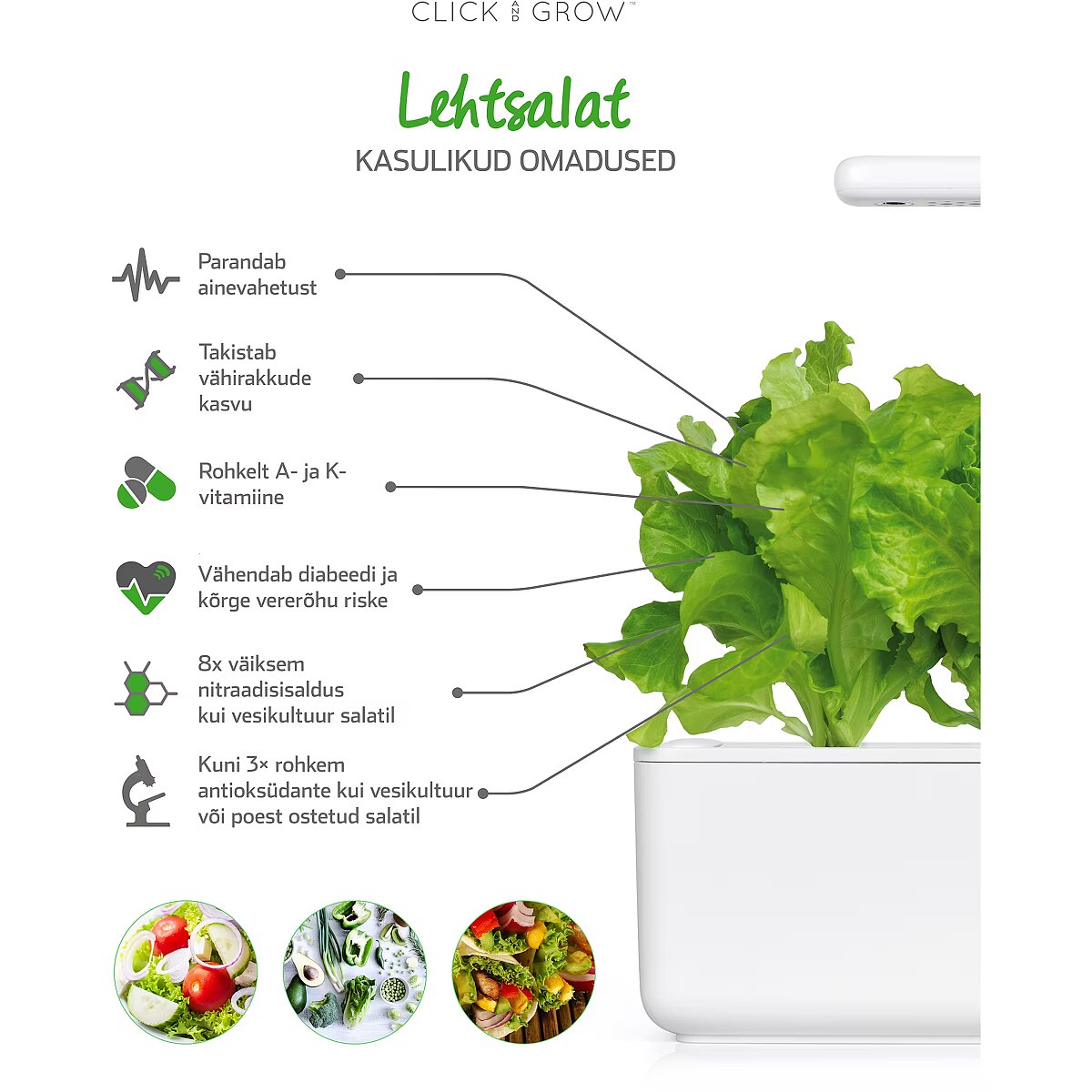 description_et - Lehtsalat on täisväärtuslik ja toitainerikas köögivili, mis pakatab mineraalidest ning A- ja K-vitamiinidest. Lisaks aitab see kaasa tervislikule ainevahetusele tänu valkude ja kiudainete rohkusele ning tagab normaalse organite töö ja tugevdab immuunsussüsteemi. Click & Grow lehtsalat sisaldab 3× rohkem antioksüdante, kui vesiaiandis kasvatatud lehtsalat ning 2× rohkem, kui pakendatud lehtsalat poeriiulitel. Pakendis on kolm Smart Soil mulla kogumit koos taimeseemnetega, mida saab kasutada uue generatsiooni Click&Grow Smart Garden nutiaiaga. Kui soovid seda refilli kasutada vanema generatsiooni Smart Herb Garden nutika ürdiaiaga, siis peavad Sul olema selle plastikust kapslid alles hoitud.