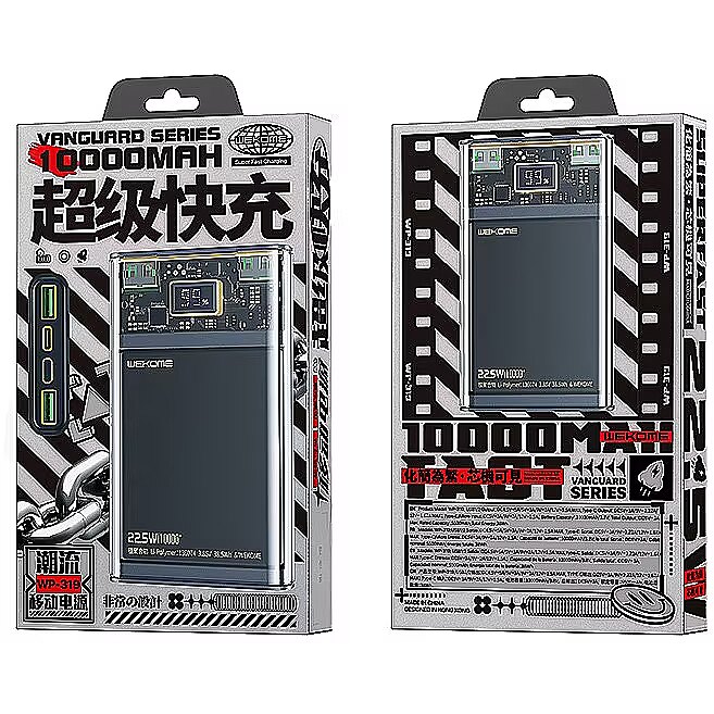 Description - The WEKOME WP-321 Vanguard Series power bank is an extremely stylish and durable design that allows you to use it comfortably and safely in any conditions. You can connect several devices to it at the same time and not worry about their safety, the advanced protection system effectively prevents their damage. The built-in LED display makes the product easy to use, and thanks to its compact size and light weight, you can take it almost anywhere. Product features: Material: ABS+PC Battery type: Lithium-polymer Battery capacity: 20000 mAh Rated capacity: 1100 mAh Input voltage: USB-C: DC5V/3A 9V/2A 12V/1.5A Output voltage: USBx2: DC4.5V/5A 5V/3A 9V/2A 12V/1.5A USB-C: DC5V/3A 9V/2.22A 12V/1.5A Power: PD 20W+QC 3.0 22.5W Super fast charging Digital LCD LED display  Weight: 350g