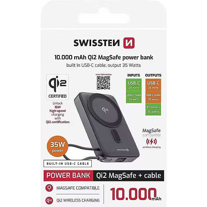 description_lv - Kompaktais un jaudīgais SWISSTEN Qi2 pārnēsājamais akumulators piedāvā jaunākās tehnoloģijas ātrai un ērtai uzlādei. Ar jauno Qi2 standartu un līdz pat 35 W izejas jaudu tas var viegli uzlādēt ne tikai viedtālruņus, bet arī prasīgākas ierīces, piemēram, planšetdatorus vai klēpjdatorus. Ideāls risinājums ceļojumiem, birojam un ikdienas lietošanai.
