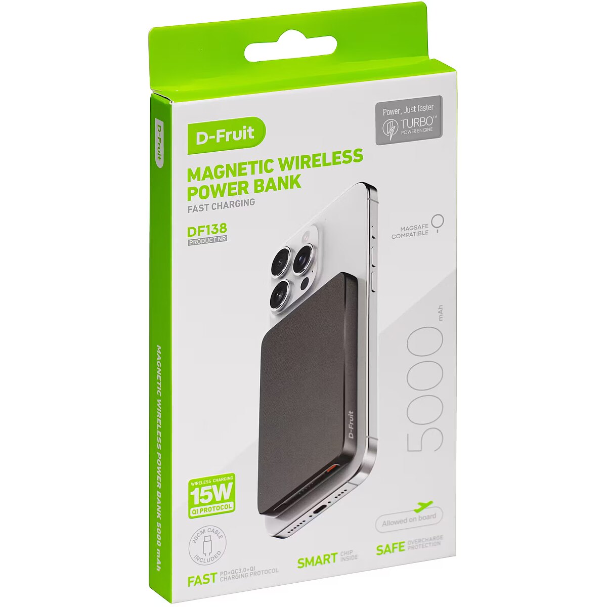 description_en - A power bank is an extremely convenient tool in the smart age. It allows you to charge not only your smartphone, but also Bluetooth headphones, tablets and other devices when you are away from a wall outlet. This way, you don't have to worry about whether the battery will last until the end of the day. With a power bank, you can leave your smart device charging at the bottom of your bag and happily carry on with your daily activities. The D-Fruit DF138 Wireless power bank is the ideal choice for those who value speed and convenience when charging smart devices. Thanks to MagSafe technology, you can also charge your smartphone wirelessly - with integrated magnets, the power bank attaches securely to the phone and starts charging it immediately. In addition, it also has a USB-C output, which also functions as an input port for charging the power bank. 5000 mAh capacity Maximum output power: 15 W Supports Power Delivery and Quick Charge 3.0 fast charging USB-C port can be used to charge both devices and the power bank itself Suitable for hand luggage and air travel Charging cable included