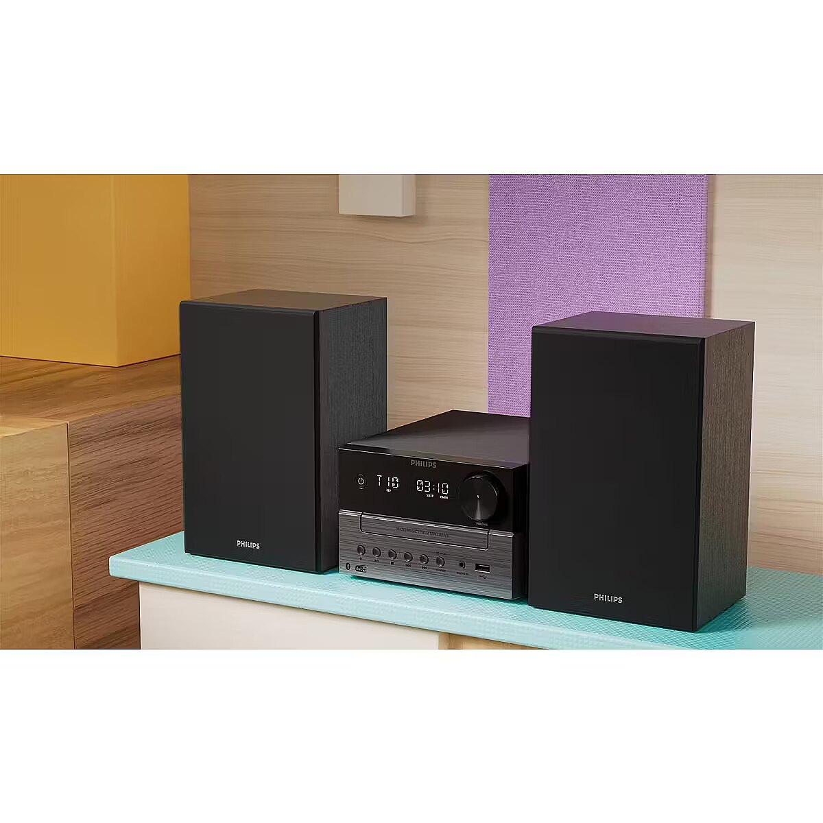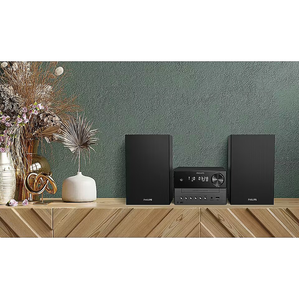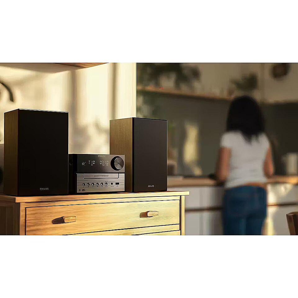 Микросистема подходит для прослушивания музыки с различных источников и легко вписывается в интерьер благодаря компактным размерам. Чёрный цвет корпуса подчёркивает сдержанный и универсальный стиль линейки Philips.