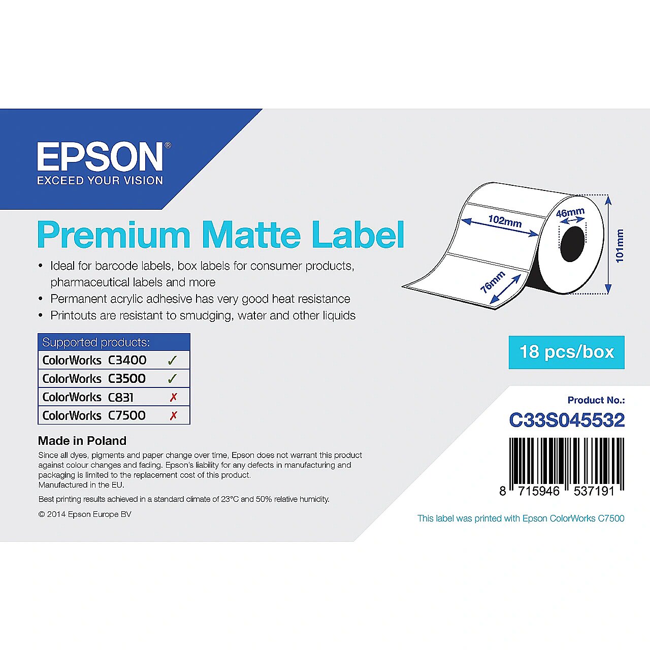 ShortSummaryDescription - Epson Premium Matte Label - Die-cut Roll: 102mm x 76mm, 440 labels, White, Inkjet, Acrylic, Permanent, Matte, Epson TM-C3400BK Epson TM-C3400-LT Epson ColorWorks C7500G Epson ColorWorks C7500 ColorWorks...