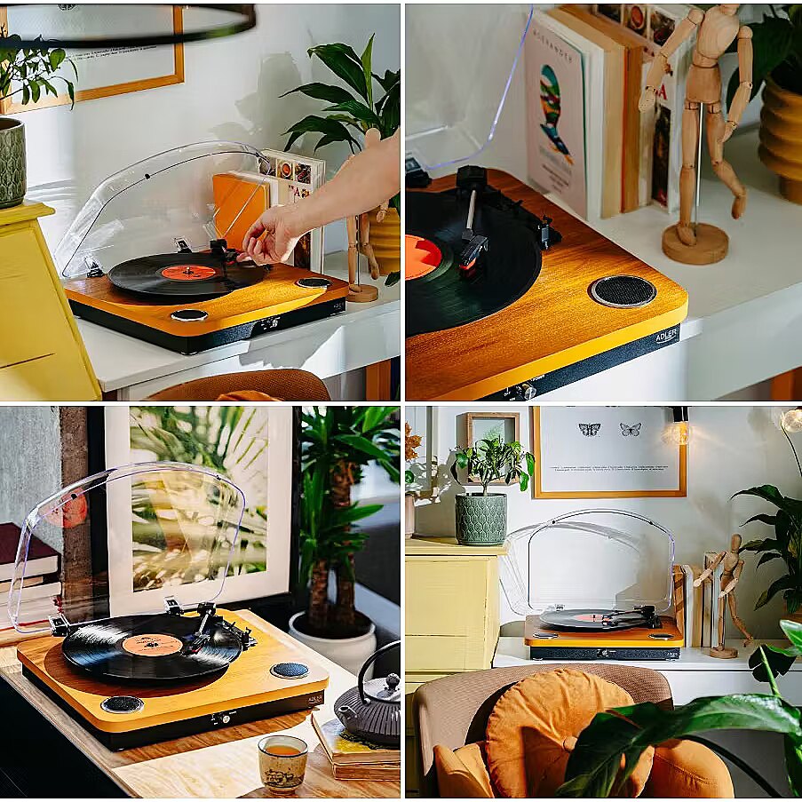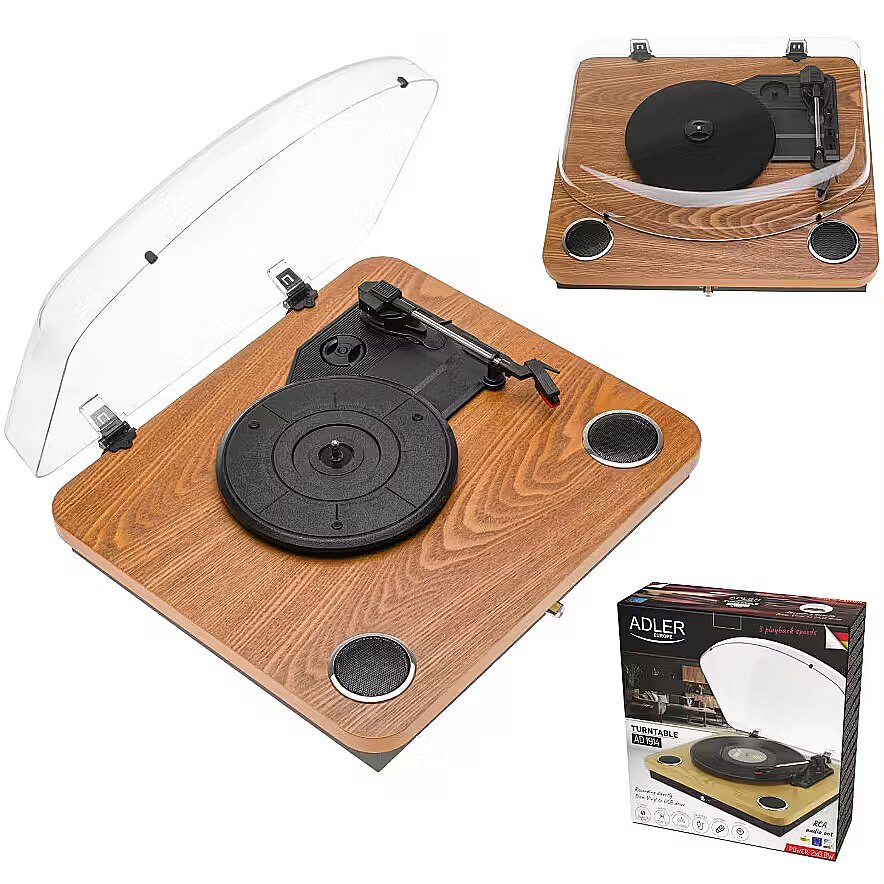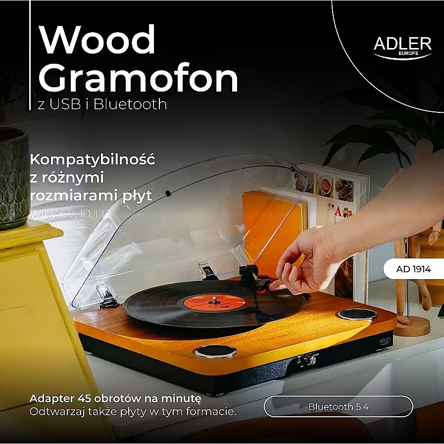 Description - Odkryj magię analogowego dźwięku w nowoczesnym wydaniu! Adler AD 1914 to elegancki gramofon, który łączy klasyczne brzmienie płyt winylowych z nowoczesnymi funkcjami, takimi jak Bluetooth 5.4 i nagrywanie na USB. Idealny dla miłośników muzyki, którzy cenią zarówno styl, jak i funkcjonalność. Główne cechy: Obsługa trzech prędkości - odtwarza płyty z prędkością 33 1/3, 45 i 75 obrotów na minutę, dzięki czemu możesz cieszyć się każdą kolekcją winyli. Kompatybilność z różnymi rozmiarami płyt - obsługuje winyle 7, 10, i 12. Wbudowane głośniki stereo - moc 2 x 0,8 W zapewnia czysty i przyjemny dźwięk. Odtwarzanie przez Bluetooth 5.4 - przesyłaj muzykę bezprzewodowo z telefonu, tabletu lub laptopa. Nagrywanie na USB - digitalizuj swoje ulubione winyle i zapisuj pliki bezpośrednio na pendrive. Wysokiej jakości wkładka ceramiczna - zapewnia precyzyjne odczytywanie dźwięku i dłuższą żywotność. Wyjście RCA - możliwość podłączenia gramofonu do zewnętrznych głośników lub systemu audio. Napęd paskowy i automatyczne zatrzymanie ramienia - dla stabilnej i płynnej pracy. W zestawie: Mata antypoślizgowa - ochrona dla Twoich płyt i lepsza jakość dźwięku. Adapter 45 obrotów na minutę - odtwarzaj także płyty w tym formacie. Stylowy design sprawia, że gramofon Adler AD 1914 - doskonale wpasuje się w każde wnętrze - zarówno klasyczne, jak i nowoczesne. Ciesz się ulubioną muzyką w analogowej jakości i digitalizuj swoje kolekcje dzięki innowacyjnym funkcjom.