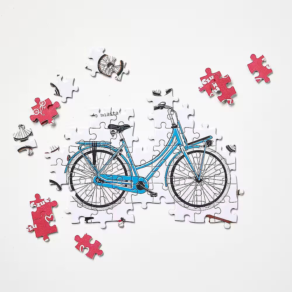 To styl życia! Kilkadziesiąt wyjątkowych rowerów tworzy dużą plakatową ilustrację. Ułożenie puzzli to nie lada wyzwanie, ale satysfakcja z ukończenia jest równie wielka, jak osiągnięcie mety na wymagającym etapie. To frajda dla każdego miłośnika dwóch kółek.