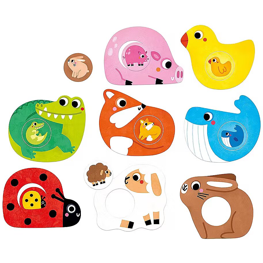 DuĹźe, kolorowe, dwuelementowe ukĹadanki przedstawiajÄ urocze zwierzÄtka. Zabawa polega na dopasowywaniu kĂłĹeczek z maluszkami do odpowiednich tabliczek, co jest prostsze niĹź ĹÄczenie tradycyjnych elementĂłw. MoĹźna to zrobiÄ tyĹ na przĂłd, do gĂłry nogami, a nawet pomiÄdzy zwierzÄtami a kaĹźde dopasowanie to powĂłd do dumy i radoĹci.