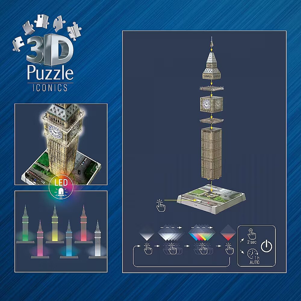 Description - Puzzle 3D Big Ben Londyn Tak ekscytujące - tak relaksujące - tak oryginalne! Odkryj wyjątkową zabawę w układaniu puzzli w trzecim wymiarze dzięki puzzlom 3D firmy Ravensburger! Dzięki naszej technologii Easy Click plastikowe elementy puzzli idealnie do siebie pasują. Twórz niesamowite obiekty 3D z indywidualnie ukształtowanych i giętkich elementów puzzli - bez użycia kleju! Ułóż najsłynniejsze budynki świata, takie jak Wieża Eiffla czy Empire State Building, lub znajdź swój ulubiony obrazek na kulistej układance 3D w naszej szerokiej ofercie wzorów o różnej liczbie elementów. Miłego układania w 3D!