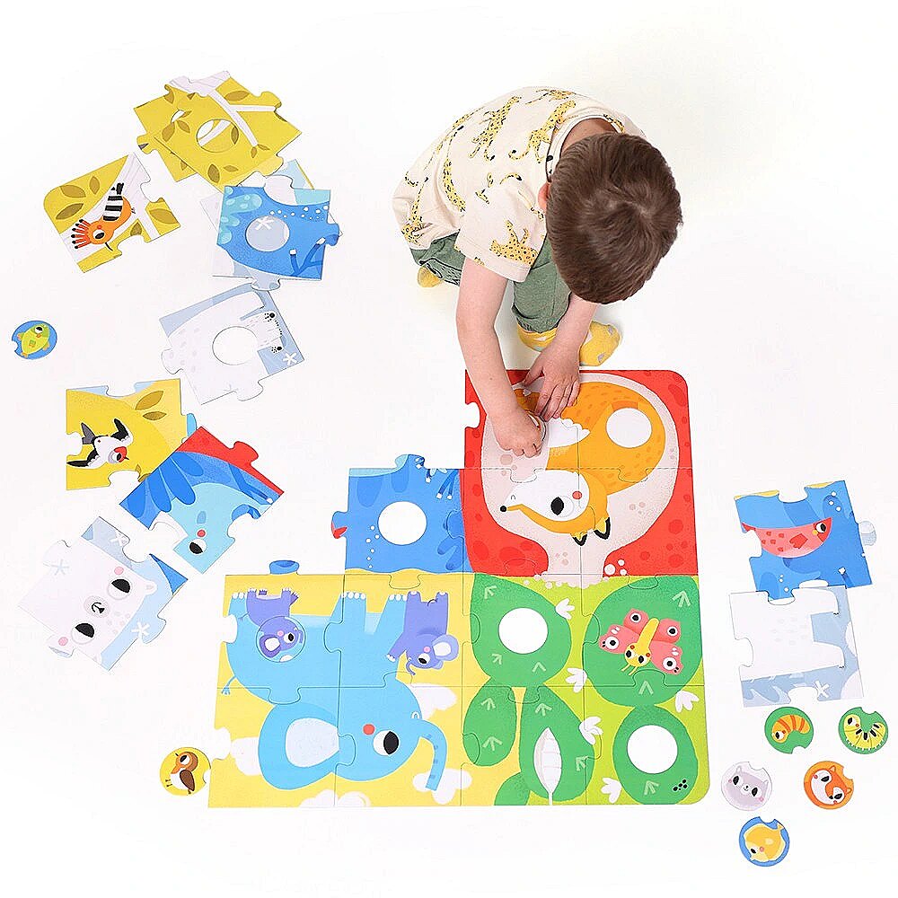 Description - Big hole jigsaw puzzle Animals Meet the inhabitants of different parts of the world! This jigsaw puzzle has everything children love: friendly animals and interchangeable circles. The educational puzzle of impressive size is colourful and beautifully illustrated. Comprising traditional puzzles and wheels that can be rearranged at will, the set allows for plenty of all-round play. Putting the picture together is just one of them! More ideas can be found in the accompanying activity guide. The set is perfect for the home, nursery or kindergarten. Who will you invite to play with you? A unique feature: the wheels can be interchanged at will. The large and durable pieces are tailored to fit little hands.