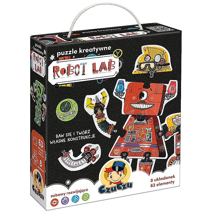 Description - Creative puzzle 63 pieces - Robot Lab Calling young constructors to our workshop! In the educational set you will find 63 pieces, 28 of which are double-sided. Most importantly, they can be freely combined with each other! You can build 8 large robots from the box and then, thanks to the interchangeable parts, change their appearance and functions at will. You can also design your own robots and create other constructions! A unique feature: all puzzles can be combined with each other at will, giving you lots of possibilities for fun. The Robot Lab creative puzzles allow for lots of creative and developing fun. It is not only a great way to develop small motor skills, perceptiveness and imagination, but also to get preschool children interested in technology and inventions. Start the fun by arranging the 8 robots. Take a look at them and guess what they might be used for? Find a cat robot and a fireman robot! Use spare parts to change and improve existing constructions. Build constructions using as many parts as possible. Or build a robot with specific colours. How about drawing your own machines? Or create even more spare parts from cardboard and paper? Build your own robots your imagination and the possibilities for fun are endless!