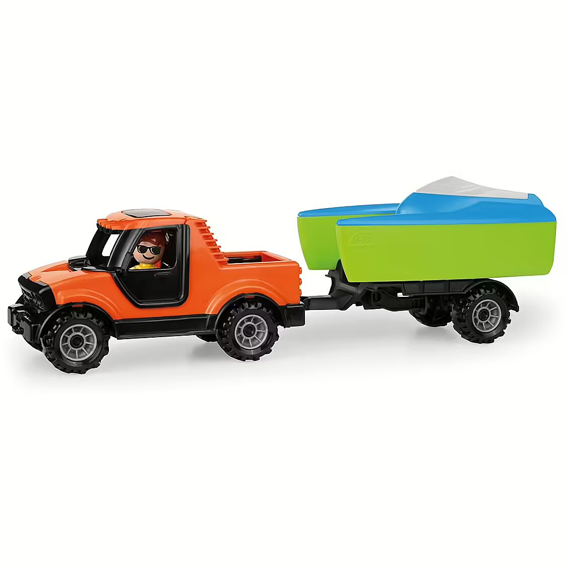 Description - Zestaw Truckies Pickup z przyczepą Zestaw składający się z pickupa Truckies, przyczepy do przewozu łodzi i żaglówki. Nadaje się do wszystkich łodzi. Osie ze stali ocynkowanej. Kabina, którą można otworzyć i się nią bawić. Zaczep przyczepy. Z figurką LENA. Nadaje się do stosowania wewnątrz i na zewnątrz.