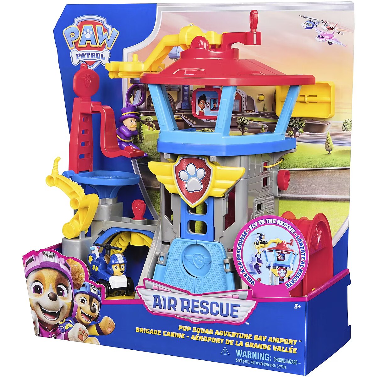 LongDesc - Create thrilling adventures in the Adventure Bay Airport Playset! Standing over 12 inches tall, this playset features over 7 play areas to explore, and an Air Rescue themed Chase Pup Squad Racer! When it’s time for action, head over to the command center to view the mission monitor! Humdinger is in trouble again and is stuck on the radar tower! Have no fear, Chase is on the case! Attach your PAW Patrol toy car to the rotating flight arm and spin it around to catch Humdinger before it’s too late! After your rescue, stop by the carwash, then head to the fueling station for a fill-up, before hopping into the vehicle launcher for another high-speed rescue! PAW Patrol preschool toys & toddler learning toys are gifts for kids that foster imaginative pretend play and enhances fine motor skills. Relive your favorite moments from PAW Patrol seasons, like the Mighty Pups and PAW Patrol Movie, then create new adventures with the PAW Patrol pups and their toy cars (each sold separately). Elevate the excitement with the complete Action Pups & Air Rescue sets, which include PAW Patrol vehicles, action figures & toddler toys, for endless hours of series-inspired adventures!Includes: 1 Playset, 1 Chase Vehicle, 1 Humdinger Figure, 1 Rescue Trolley