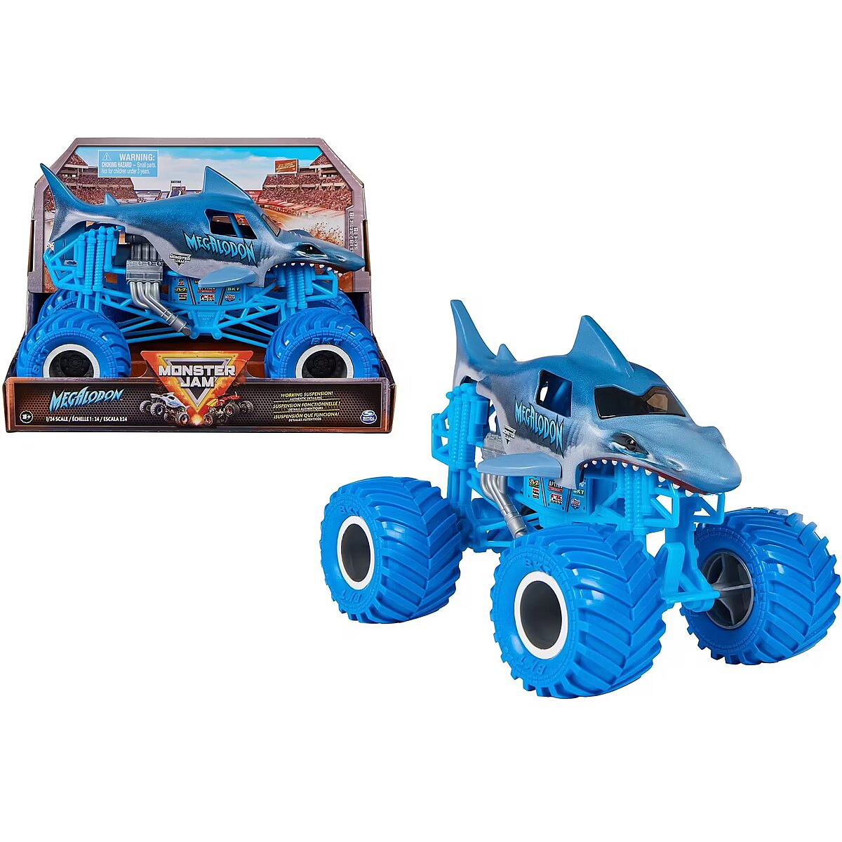 LongSummaryDescription - Monster Jam , Official Megalodon Monster Truck, Collector Die-Cast Vehicle, 1:24 Scale, Kids Toys for Boys and Girls Ages 3 and up. Product type: Monster truck, Recommended age (min): 3 yr(s), Material: Metal, Plastic, Product colour: Blue