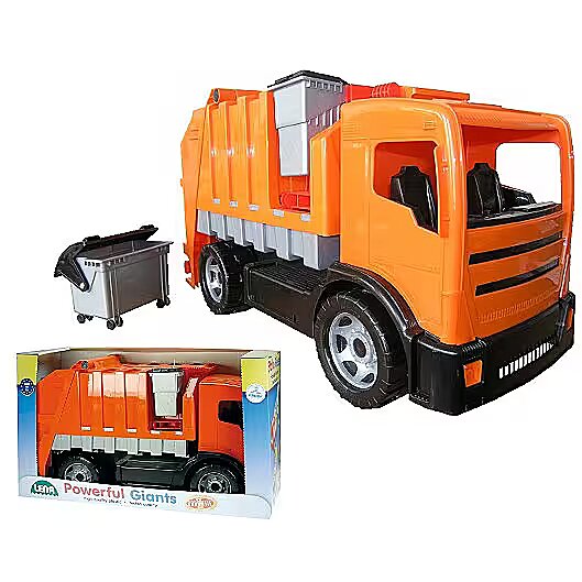 LongDesc - LENA® Powerful Giants Garbage truck orange with two axles and 6 mm galvanised steel axles. The big and the small rubbish bin can be hooked up and emptied into the vehicle. The big container can also be fixed. The rear hatch can be opened, too.