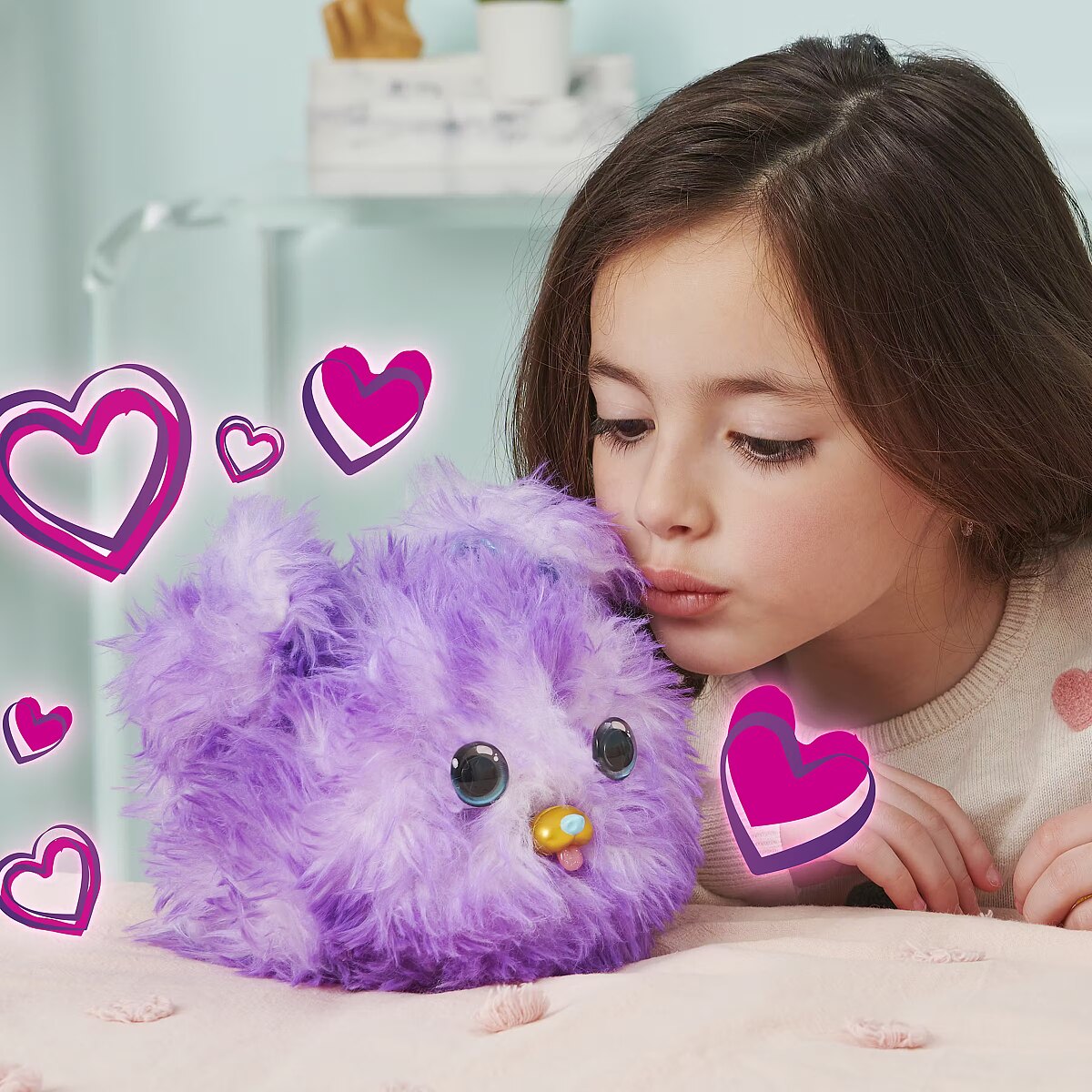 LongDesc - Introducing Fur Fluffs: fluffy interactive pets looking for their fluff-ever home! These super cute toys for kids feature over 100 exciting sounds and reactions and have a surprise pet reveal! Hidden inside a soft purple fluff is Pupper-Fluff. Play with your shy and timid Fur Fluffs toy to encourage her out of hiding and earn her trust. You can pet, roll, shake, toss and turn her upside down – when your fluff is feeling more comfortable, she reveals her ears! Keep playing, and her eyes will peek out, too! Once Pupper-Fluff fully trusts you, you’ll hear the celebration song and she’ll transform from fluff to pet! As you play, you’ll unlock Pupper-Fluff’s sweet and silly personality. With so many sound effects and reactions, you never know what adorable response you’ll get! This little fluff loves to eat, roll, snuggle, dance, sing and more. There are so many ways to play in both fluff and pet mode! She purrs and coos when pet, giggles and wiggles when tickled and gets dizzy if shaken. Toss your new friend in the air or turn her upside down to see her somersault! In fluff mode, feed her and scare away hiccups, play a game and more. You can even have a dance party with your Fur Fluffs! Tilt your pet left and right to play music and touch Pupper-Fluff’s head to hear her sing. Shake, toss and tilt your pet for even more music sounds, like a cute high note! At any time, transform your Fur Fluffs pet back to fluff, or change from fluff to pet again and again. For more fluffy fun, look for Fur Fluffs Purr ‘n Fluff (sold separately)! Fur Fluffs toys are perfect for pretend play and make great birthday gifts, Christmas gifts or gifts for kids aged 5 and up for any occasion. Each Fur Fluffs measures approximately 7 in. in diameter. Includes 3 AA batteries. Discover the sweetest surprise with Fur Fluffs!Includes: 1 Fur Fluffs, 1 Quick Start Guide, 1 Instruction Sheet