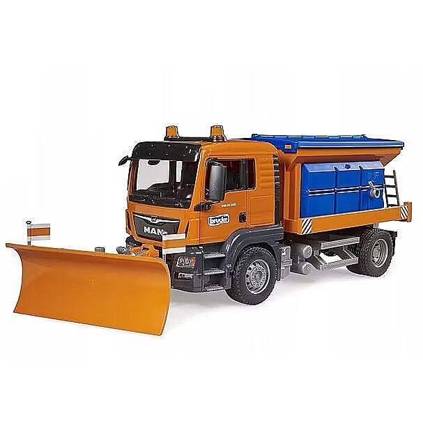 Description - MAN snow plough An excellent educational toy whose main features are: Glazed cab with folding mirrors and opening doors Soft rubber tyres with tread Openable hopper Foldable spreader (transport and working position) Removable blade Features typical Bruder toy qualities: Superior build quality Perfect reproduction Functionality