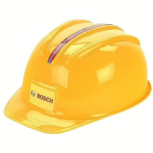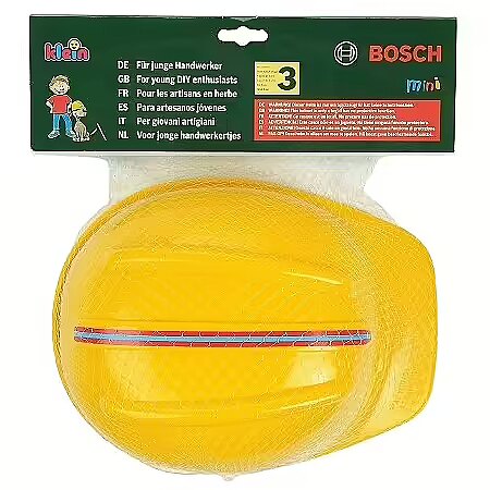 Description - Bosch Construction Helmet The Klein construction helmets were created under licence from Bosch and are therefore an exact copy of the real helmet produced by the company. The construction helmet with visor is in yellow and has been decorated with the Bosch logo on the forehead, with an additional red and blue stripe decorating the entire helmet at the top. The helmet is adjustable, so it will fit children of different ages. Klein toys allow children to imitate their parents in everyday household activities in a realistic and safe way, providing free play and learning. The construction or safety helmet can be a great addition to other sets in the Bosch series from Klein. Whether for working and playing with a drill, chainsaw, jackhammer or at the workshop, every little DIYer should wear a safety helmet. It is sure to appeal to all little tinkerers.