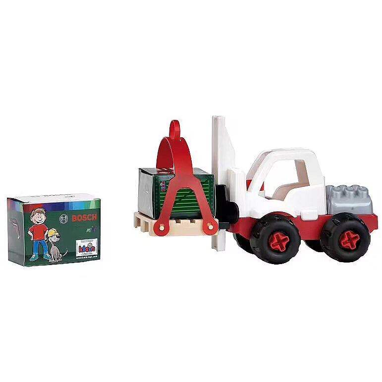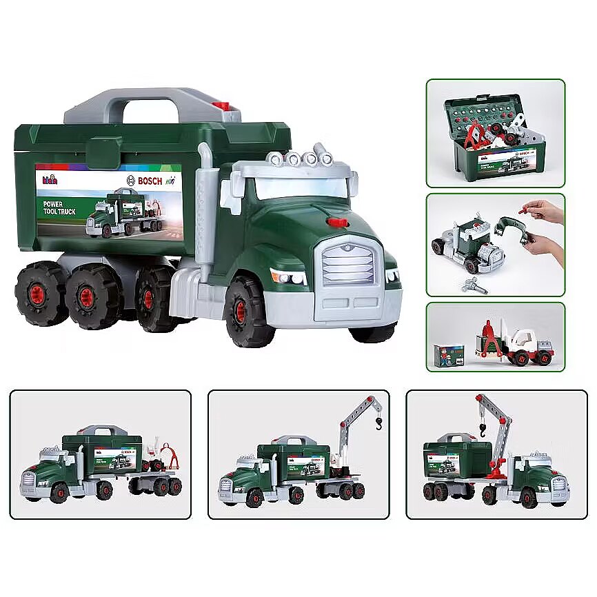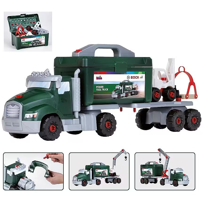 Description - Klein 8626 Bosch Screwdriver Truck The truck comes from the Bosch mini toy series created under licence from Bosch, which is why the tools included in the set are faithful copies of the brand's actual tools. The truck will provide lots of fun. The vehicle can be assembled and disassembled at will, all thanks to the manual screwdriver included in the set. The set consists of 86 parts and allows you to create many vehicles, so the fun will never end. The truck is equipped with a removable toolbox, so getting to the place where repairs are needed will be extremely easy. The large lorry from Klein is a great gift idea for boys who like to play at DIY. The vehicle is 47 centimetres long and can be extended up to 70 centimetres. The car has a fully loaded toolbox with everything you need to have fun. The tools included in the set will allow children to turn this lorry into a large transporter that can accommodate a crane, forklift and pallet. The toy is made of high-quality plastic, making it completely safe for young children. The attention to detail and solid construction of the car mean that it will serve children for a long time. While playing, children develop their creativity and practise their dexterity and motor skills.