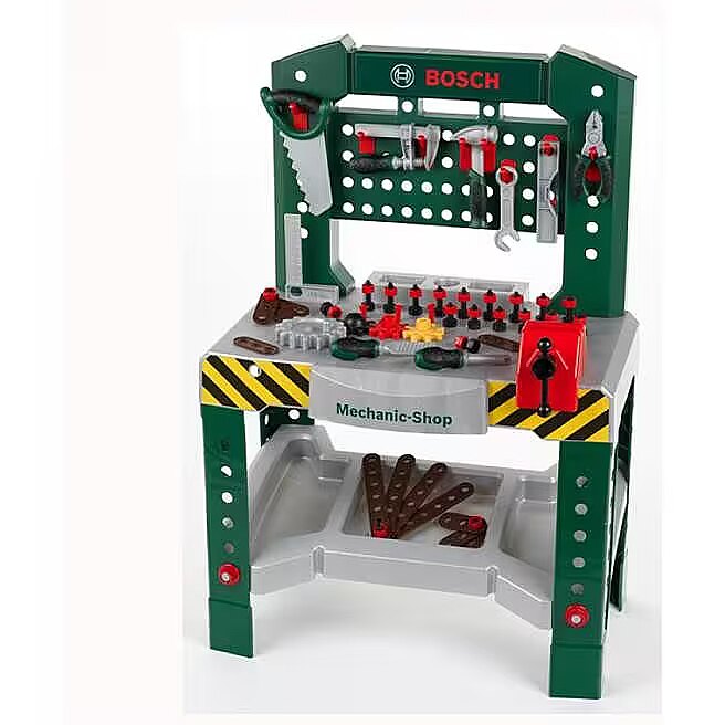 Accessories included - - Gray-green workbench, walls and shelves of the workshop