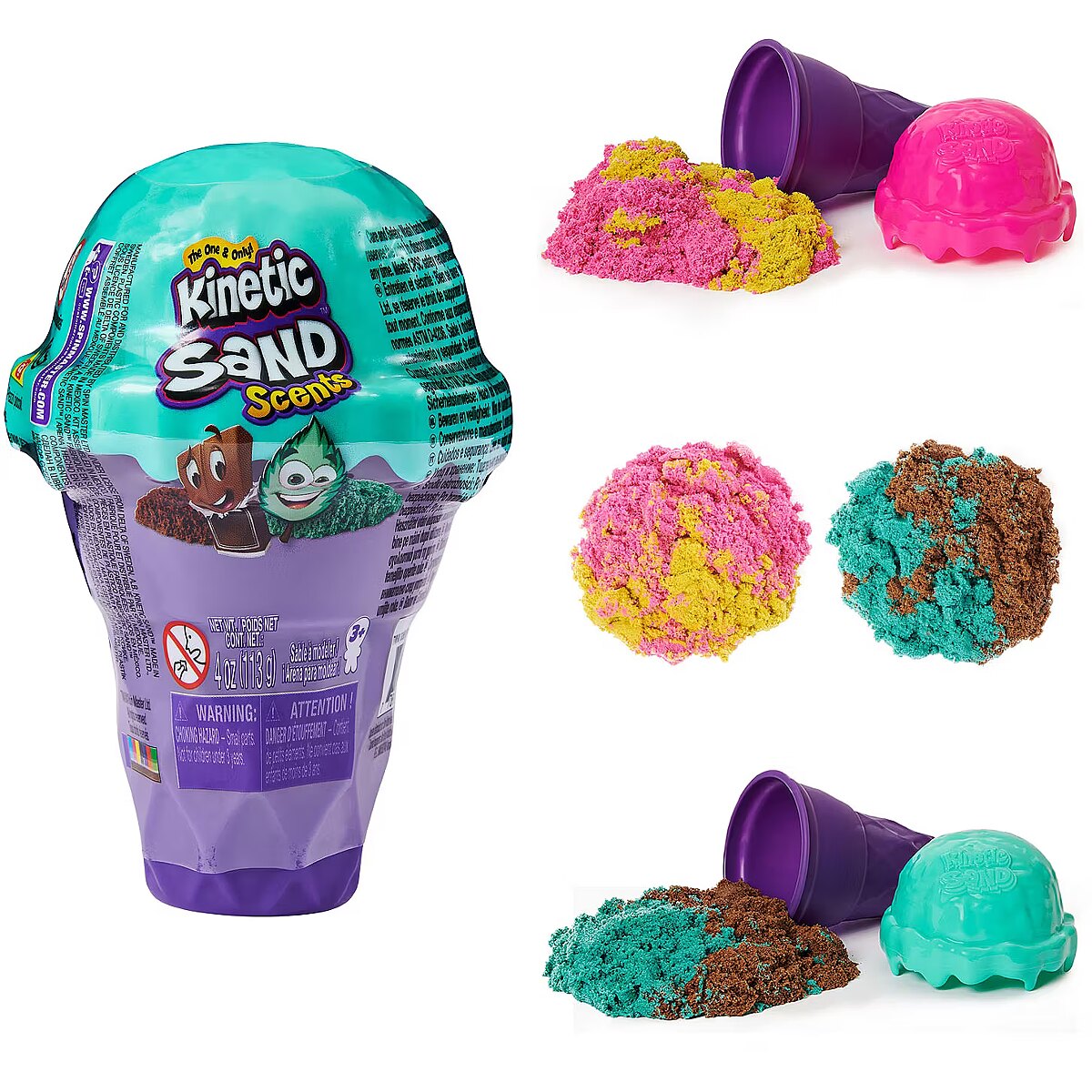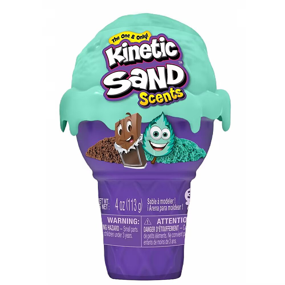 LongDesc - Kinetic Sand Scents just got a whole lot sweeter! Inside the Ice Cream Cone Container, discover two delightful scents of all-natural Kinetic Sand that combine to smell just like classic ice cream flavors: Mint Chocolate or Strawberry Banana! Kinetic Sand is the original magical, moldable and mesmerizing sand. It flows through your hands and never dries out, so you can play again and again. Pop the ice cream scoop off of your container to reveal 2oz of each scented Kinetic Sand color! Play with the colors individually or mix them both together into your Kinetic ice cream scent, creating a new color! Use the ice cream scoop and cone as molds and store your sand inside when you’re finished playing. Create again and again and let Kinetic Sand flow through your hands. It’s so satisfying, you won’t be able to put it down – and now, you won’t be able to resist smelling it! Kinetic Sand is non-toxic and hypoallergenic. It’s made from natural sand and is wheat, gluten and casein free. Collect all of the Ice Cream Cone Containers (each sold separately) and discover even more ice cream fun with the Ice Cream Treats Playset (sold separately)! Bring home ice cream-inspired Kinetic Sand Scents with the Ice Cream Cone Container!Includes: 4oz Scented Kinetic Sand (2 Colors, 2oz of Each), 1 Ice Cream Cone Container