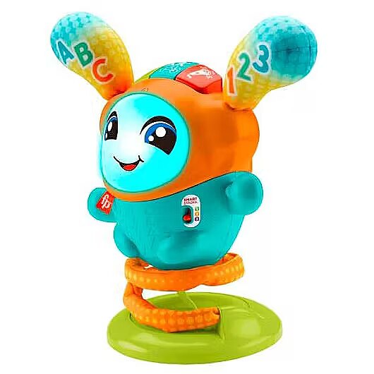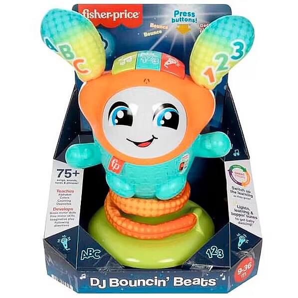 Description - Organise a dance party for your little one with the Dancing DJ musical educational toy from Fisher-Price! When baby presses the buttons, the interactive dancing friend comes to life with colourful lights and more than 75 sound activations consisting of noises, melodies, songs, and utterances that introduce toddlers to letters, counting, colours and more. This musical toy has a special soft spring Dancing DJ cheerfully bounces, inviting active play! With 3 learning levels, the Dancing DJ encourages toddlers to dance, jump and have fun learning. And that's not all! Dancing DJ also has a recording function say something and he will repeat it, transforming it into a short, funny song! The toy comes in a Polish language version. Interactive musical educational toy on a soft spring moves while playing Dancing DJ bounces merrily to happy music! 3 learning levels introduce the toddler to the world of letters, colours, counting from 1 to 10 and opposites Press the educational and music buttons to activate over 75 activations: songs, sounds, statements, coloured lights and movements Press the microphone button to record and play your own remixes! Encourages young children aged 936 months to dance, move and jump to the beat