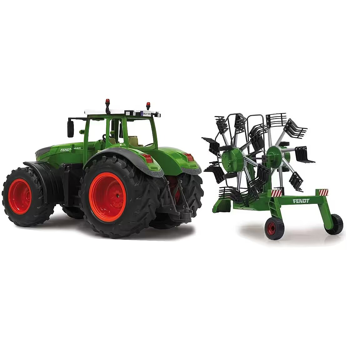 Description - Fendt 1050 Vario Tractor + Rotary Tedder This great 1:16 scale tractor is a great toy for young agricultural and machinery enthusiasts. Here are some key features of this toy: Control: it is equipped with a remote control that allows you to drive forwards, backwards, right and left. Operating frequency: operates at 2.4 GHz. Lighting: has LEDs that illuminate the road. Engine sound: when switched on, you can hear the sound of the engine starting. Age: recommended for children from 8 years. The Fendt 1050 Vario tractor is not only a great toy, but also a great opportunity to learn and develop manual skills. Thanks to it, little ones can imagine driving a large tractor in the field or in the garden. It is an ideal gift for young lovers of agricultural machinery! The Twin Roto rake in 1:16 scale has radio-controlled, lifting boom arms. The tines of the Twin Roto rake rotate while driving, providing a realistic image of the work of the agricultural machine. Basic functions: Tines rotate while driving Remote controlled folding arms Towing hitch Rake switched on with the remote control of the remote controlled JAMARA Fendt 1050 Vario 1:16 2.4Ghz tractor. The rake is connected to the socket in the tractor and can be started using the buttons on the tractor remote control.