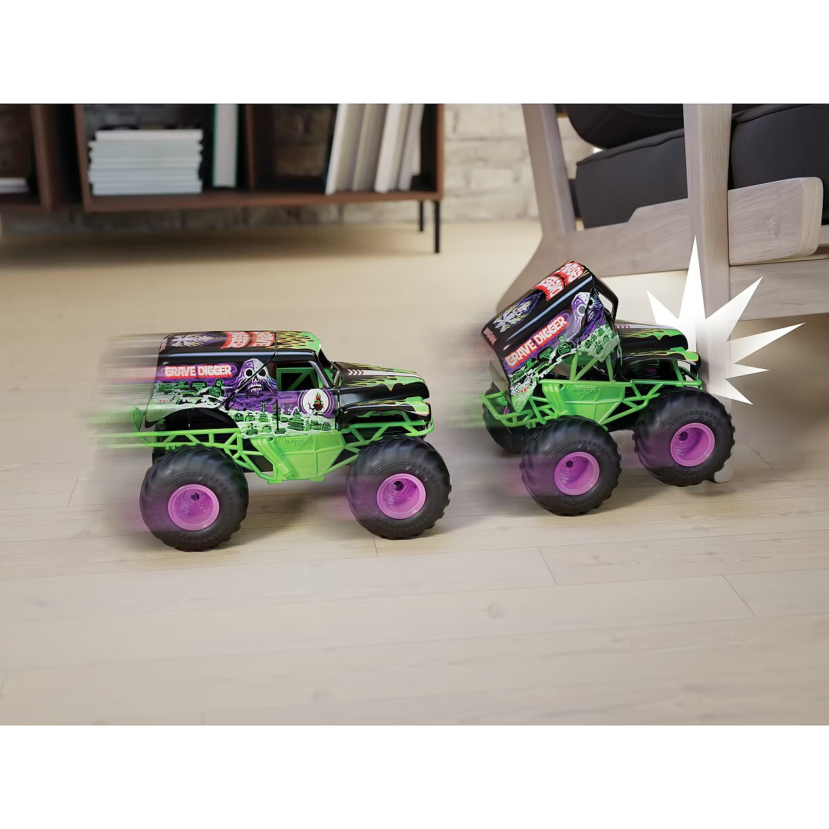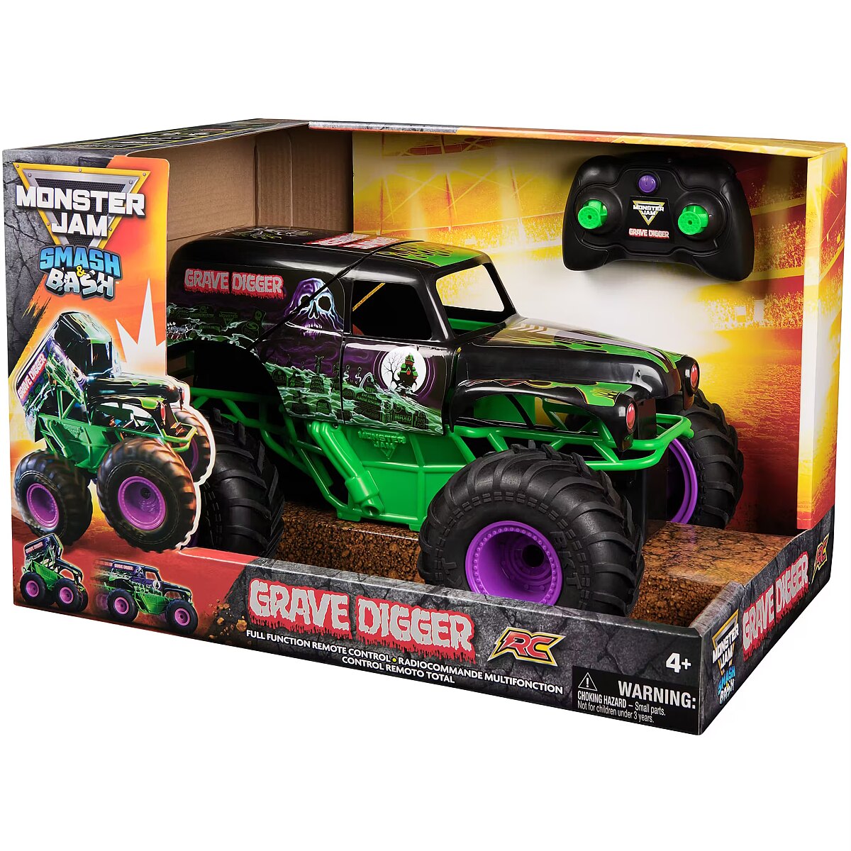 LongDesc - Experience the Monster Jam action in your hands with the Smash & Bash Grave Digger RC. This 1:15 scale remote control Monster jam monster truck can take the heat, running into walls and obstacles, indoors and outdoors. With soft rubber tires, authentic graphics and details, pull off epic maneuvers like you are driving the real thing with the full function, easy-to-use remote control, requires 2 AAA batteries (not included). The more you crash, the more smashed your RC becomes to perform stunts and spins. Go from wrecked to repaired with a press of a button from repeatable play. With 2.4GHz frequency, you can race up to six toy vehicles at once and control the Smash & Bash Grave Digger remote truck from up to 200 feet away for up to 20 minutes on a single charge via USB-C. With so many other Monster Jam trucks and remote control cars to collect, add Grave Digger, Megalodon, El Toro Loco and more (each sold separately) to your collection and race them all! Rev up your Monster Jam toys and get ready to experience the dirt-flying, car-crushing action of Monster Jam at home to ignite passion and adventure in any fan!Includes: 1 Smash & Bash Grave Digger RC