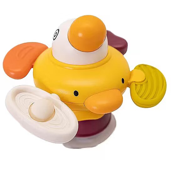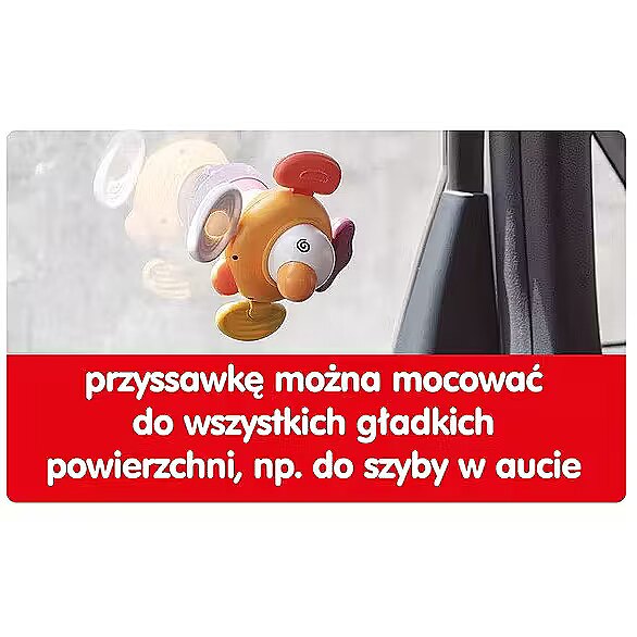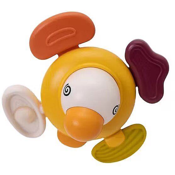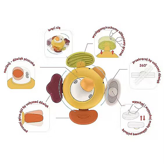 8 funkcji: Kręci się Wyciągany / ruchomy silikonowy gryzak Przekręcany element o 360 stopni z dźwiękiem Wpychanie i wypychanie małej silikonowej półkuli na jednym z elementów Poruszanie góra/dół, aby usłyszeć dźwięk Główka kaczki z piszczkiem Przy potrząsaniu grzechocze Przyssawka, dzięki której można mocować do wszystkich gładkich powierzchni np. szyby w aucie
