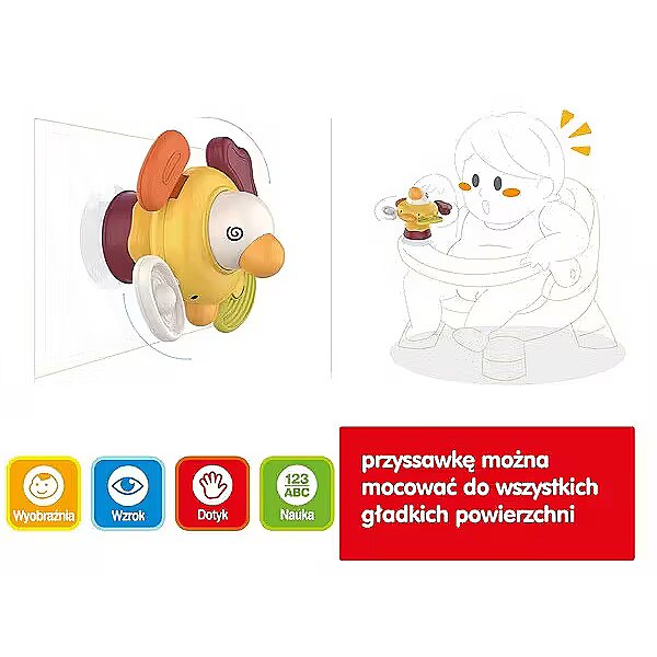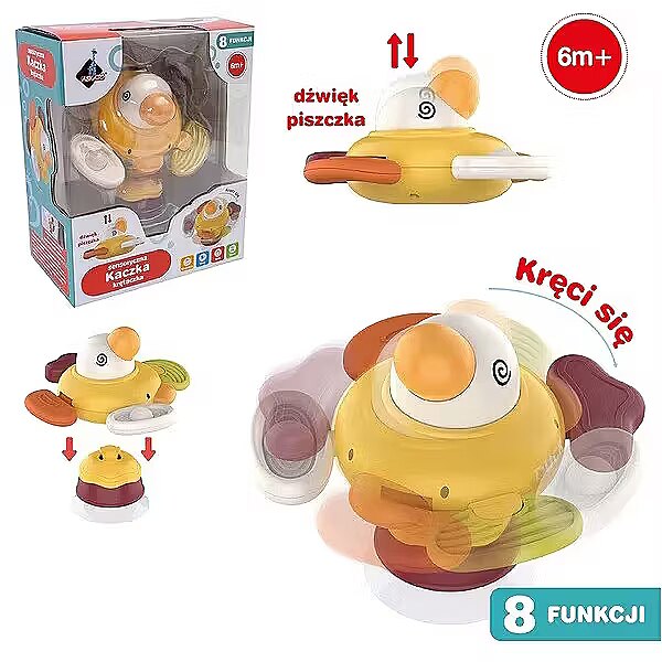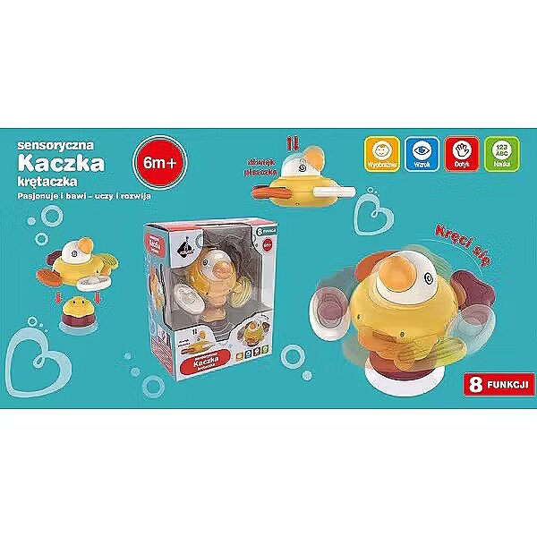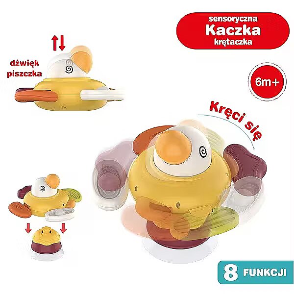 Description - Kaczuszka interaktywno-sensoryczna Zabawa sensoryczną Kaczką krętaczką pomaga w rozwoju koordynacji ruchowej oraz zmysłu wzroku, dotyku i słuchu już na bardzo wczesnym etapie rozwoju malucha. Zachęca go do aktywności podczas leżenia na brzuszku i wyciągania rączek, co ćwiczy i wzmacnia stabilność karku i siłę mięśni szyi.