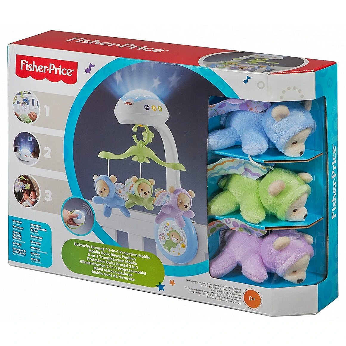 LongDesc - Create a sleepy environment for your little one with Fisher-Price Butterfly Dreams 3-In-1 Projection Mobile! This soothing night light projector turns any ceiling or wall into a starry night show with up to 30 mins of calming lullaby music, white noise or relaxing nature sounds. This white noise baby toy also stimulates your child's senses through soft lights and gentle, guiding their sensory development from birth. The slow and steady spinning motion of the adorable butterfly bears entertain and comfort little one to sleep, creating a secure environment they can truly relax in. Not to mention their sweet, smily faces that baby will love! Our helpful gifts for newborn baby are a considerate present idea for the new parents in your life as not only will their child love it, they'll love the bedtime assistance too! Check out the rest of our range for more baby toys 0-6 months, baby boy and baby girl toys 0-6 months, pram toys for babies 0-6 months, 3 months baby toys and gender neutral baby gifts.