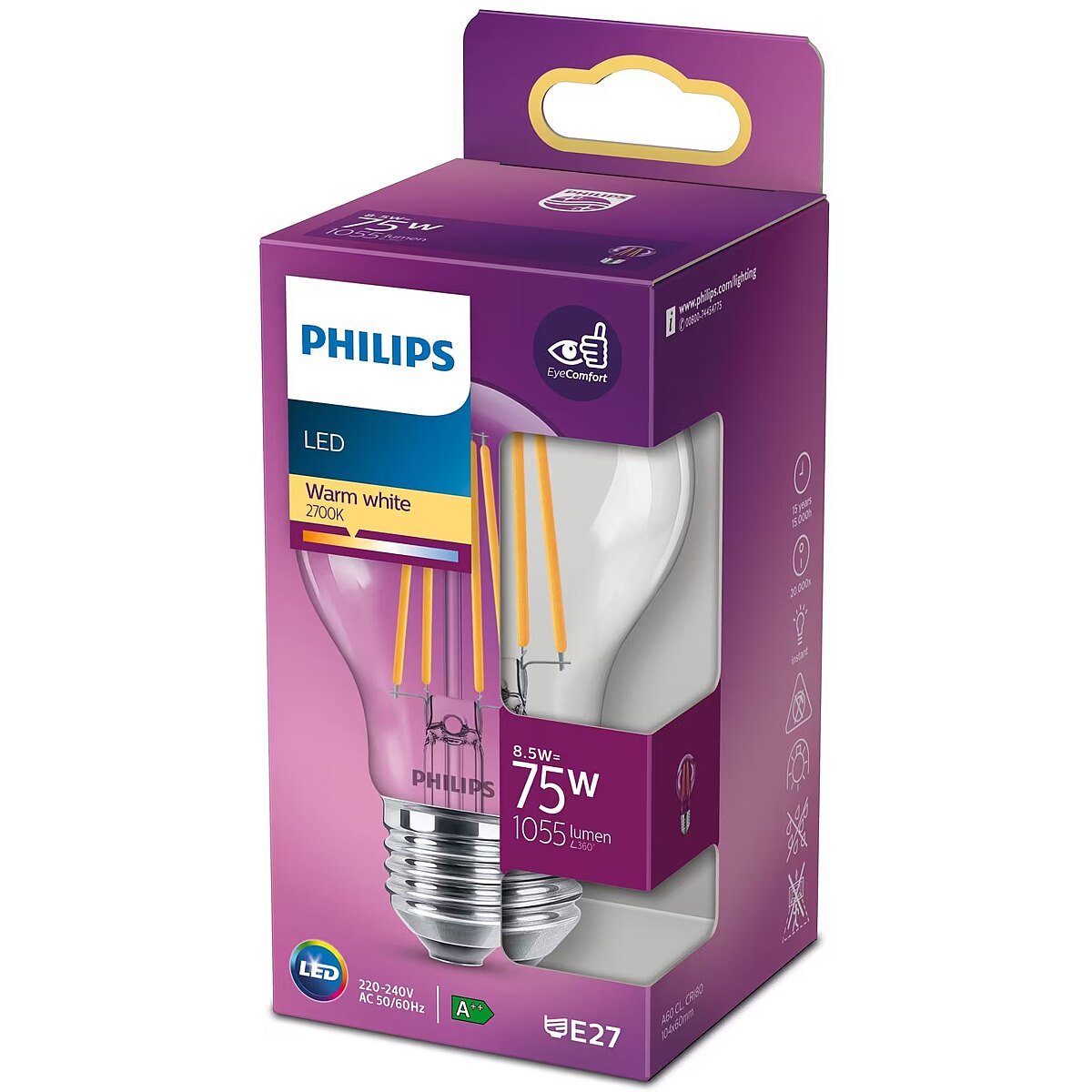 LongSummaryDescription - Philips Filament Bulb Clear 75W A60 E27. Bulb power: 8.5 W, Equivalent bulb power: 75 W, Fitting/cap type: E27, Luminous flux: 1055 lm, Bulb lifetime: 15000 h, Light colour: Warm white, Colour temperature: 2700 K, Color Rendering Index (CRI): 80, Power factor: 0.52