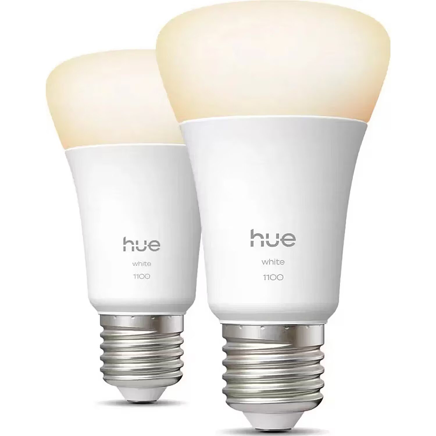 LongSummaryDescription - Philips Hue White A60 – E27 smart bulb – 1100. Type: Smart bulb, Interface: Bluetooth/Zigbee, Product colour: White. Energy efficiency class: E, Power consumption (typical): 9.5 W, Power consumption (standby): 0.1 W. Width: 60 mm, Height: 112 mm, Weight: 190 g. Package type: Box, Package width: 146 mm, Package depth: 72 mm. Quantity per pack: 2 pc(s), Number of hue bulb(s) included: 2 bulb(s)