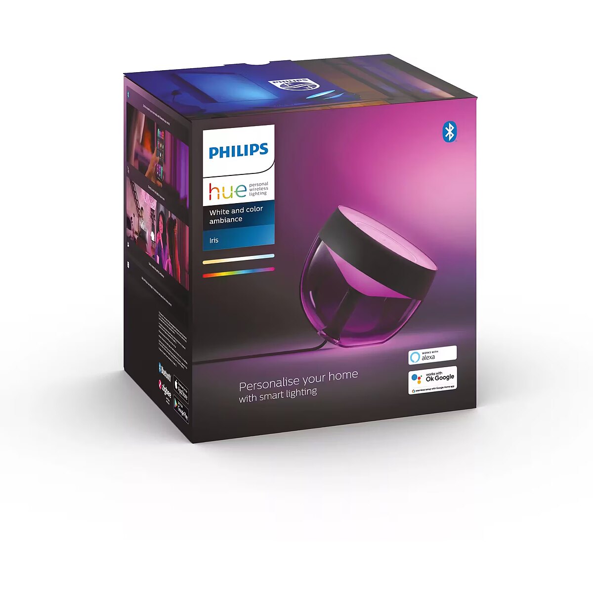 Description - Iris table lamp Set the mood in any room of your home with the stylish Philips Hue Iris lamp. With a light that both washes the wall with colour and offers a gentle backlight, the Iris provides a sophisticated, unique effect. Add a Hue Bridge to unlock the full suite of smart lighting features