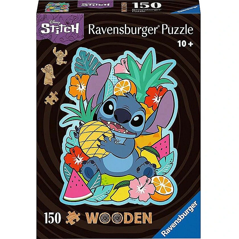 Technical_details - Puzzles from Ravensburger bring puzzle fun in premium quality: They meet the highest demands in terms of material, motif and design - and this with a huge selection of motifs, formats and levels of difficulty. Everyone will find their perfect puzzle here: from beginners to professionals. The puzzles in the Wooden Puzzle series are particularly impressive because of their material: These puzzles for adults and children aged 10 and over consist of stable, irregularly shaped wooden pieces. Small figures hidden in the puzzle (the Whimsies) provide additional fun. This puzzle has 150 pieces and features a colorful motif of the Disney character Stitch. The finished puzzle is not rectangular, but contour-shaped. It measures approximately 27 x 20 centimeters. Item number: 100039235 Kind of puzzle EAN 4005555007586 Manufacturer no. 12000758 Wooden Puzzle series Parts 150 Puzzle type Age recommendation from 10 months Target group: young people, adults Material wood Warnings Warning: Not suitable for children under 36 months! Caution: Danger of suffocation due to small parts that can be swallowed!
