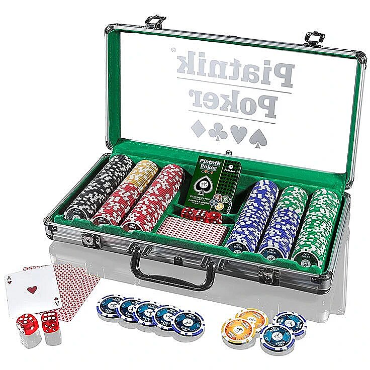 Set of 300 chips in an aluminum case. Chips with denominations, weight after 14g, on each Piatnik logo. The set also includes: 2 decks of 55 plastic cards with 63 x 88 mm poker size, 5 dice, a chip for the dealer and keys to the suitcase. Included instructions in Polish.