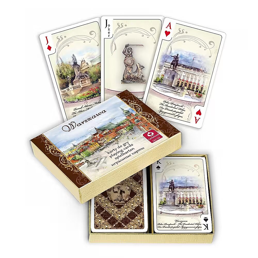 Komplet dwóch talii 55 listków zapakowane w eleganckie pudełko, doskonały pomysł na prezent, souvenir z Warszawy.