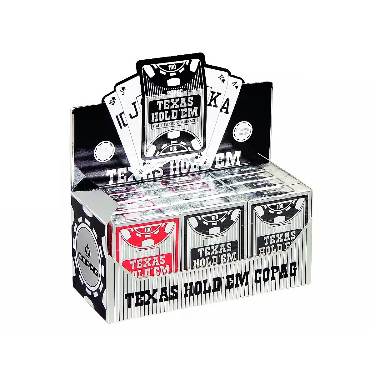 LongSummaryDescription - Copag Texas Hold'em SILVER - 4 Peek Index - TBX Red. Number of cards: 55 pc(s), Material: Plastic, Recommended age (min): 3 yr(s). Products per master (outer) case: 72 pc(s), Master (outer) case gross weight: 10.3 kg, Master (outer) case length: 224 mm. Weight: 140 g, Width: 65 mm, Depth: 20 mm