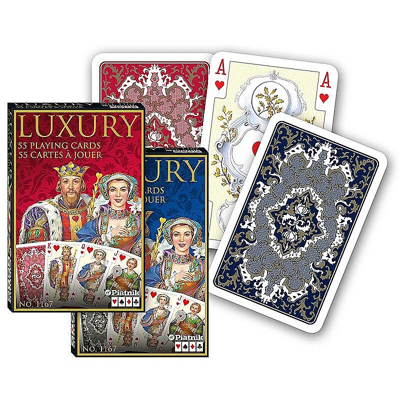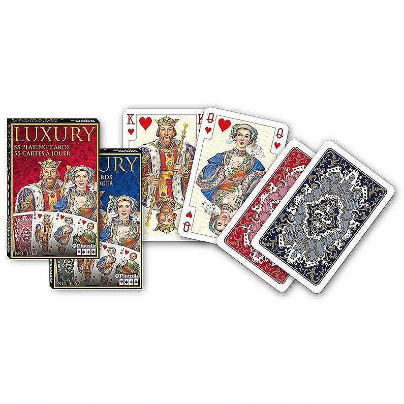 Description - Luxury cards Luxury is the true essence of cards, Piatnik's flagship design, known in Poland since the pre-war years. Now also in the form of a single deck. On the obverses one-of-a-kind Piatnik figures. The reverses are not only noble, but also symmetrical and distinctly different. The decks consist of 55 plastic cards with a weight of 310 and dimensions of 58 x 89 mm. Two designs. Product sent at random, no specific model available. Price is for 1 pc.