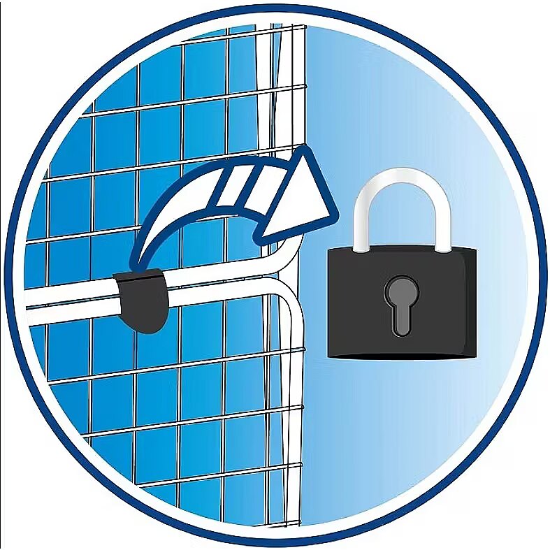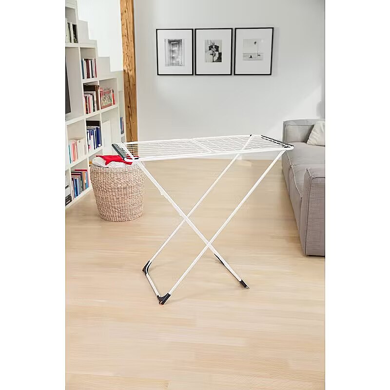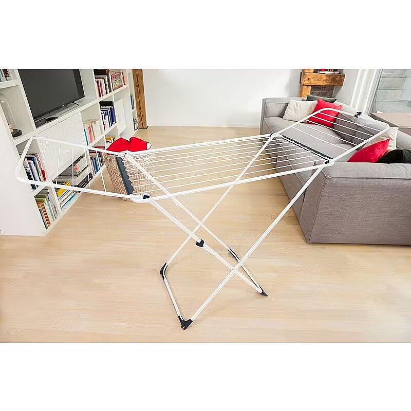 Składane nogi w kształcie litery X sprawiają, że rozkładanie suszarki jest niezwykle proste. Specjalna blokada zabezpiecza ją przed przypadkowym rozłożeniem. Wyposażona również w blokadę skrzydeł. Solidny stalowy stelaż zapewnia trwałość i stabilność. Więcej miejsca dzięki uchwytowi na skarpetki