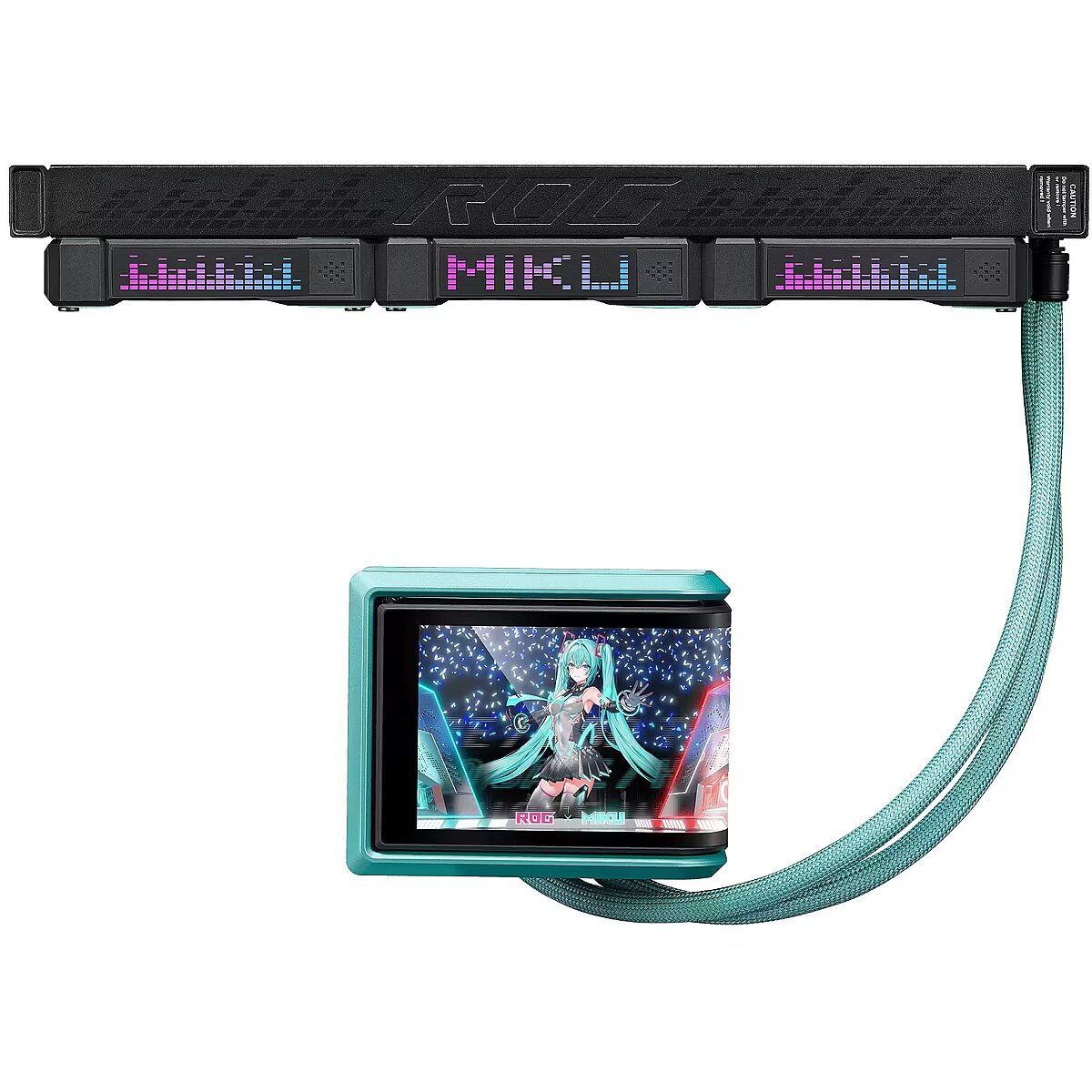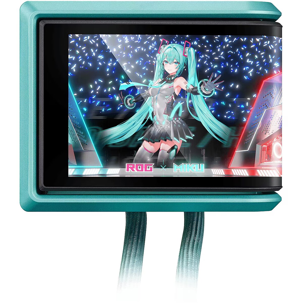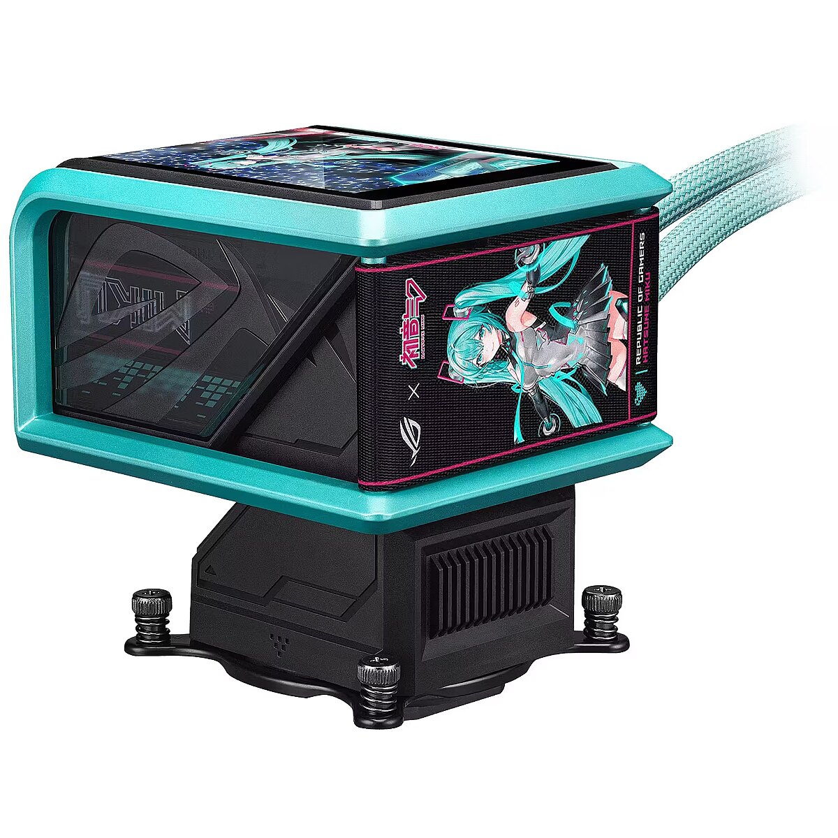 LongDesc - Feel the Beat, In-Game FeatsROG continues its collaboration with virtual pop star Hatsune Miku with a complete gaming system centered around ROG's sci-fi aesthetics and Miku's signature blue-green, pink-color scheme. The collection combines Hatsune Miku’s signature style with superior ROG performance, premium quality, and versatile functionality for competitive gameplay or daily tasks. Products include a motherboard, graphics card, PC case, all-in-one cooler, SSD enclosure, power supply, monitor, and apparels, enabling gamers to create an entire gaming setup that exudes the vibrant Miku aesthetic.HATSUNE MIKU EDITIONROG Ryuo IV 360 ARGB Hatsune Miku Edition features a 6.67-inch AMOLED display, enabling intuitive control through dedicated software to smoothly display 3D videos, customized content, or hardware information. The innovative curved-screen design breaks the boundaries between the virtual and the real. The powerful pump and ROG ARGB fans provide stable cooling performance for CPUs, including the AMD Ryzen™ 9000 series and Intel® Core™ Ultra processors.Extraordinary VisualThe 6.67-inch 2K AMOLED curved screen features a high-resolution, vibrant color display that provides the ultimate immersive visual experience.Pre-Installed High-Performance FansThe ROG RYUO IV MF-12C ARGB Fan delivers strong and stable airflow, significantly enhancing the cooling capabilities of your system. With pre-installed, daisy-chained ARGB fans, the installation process is streamlined, allowing for a hassle-free setup while maintaining optimal performance.ASUS INFOHUBThe ASUS InfoHub lets you easily add any custom content, including images, GIFs, and videos.