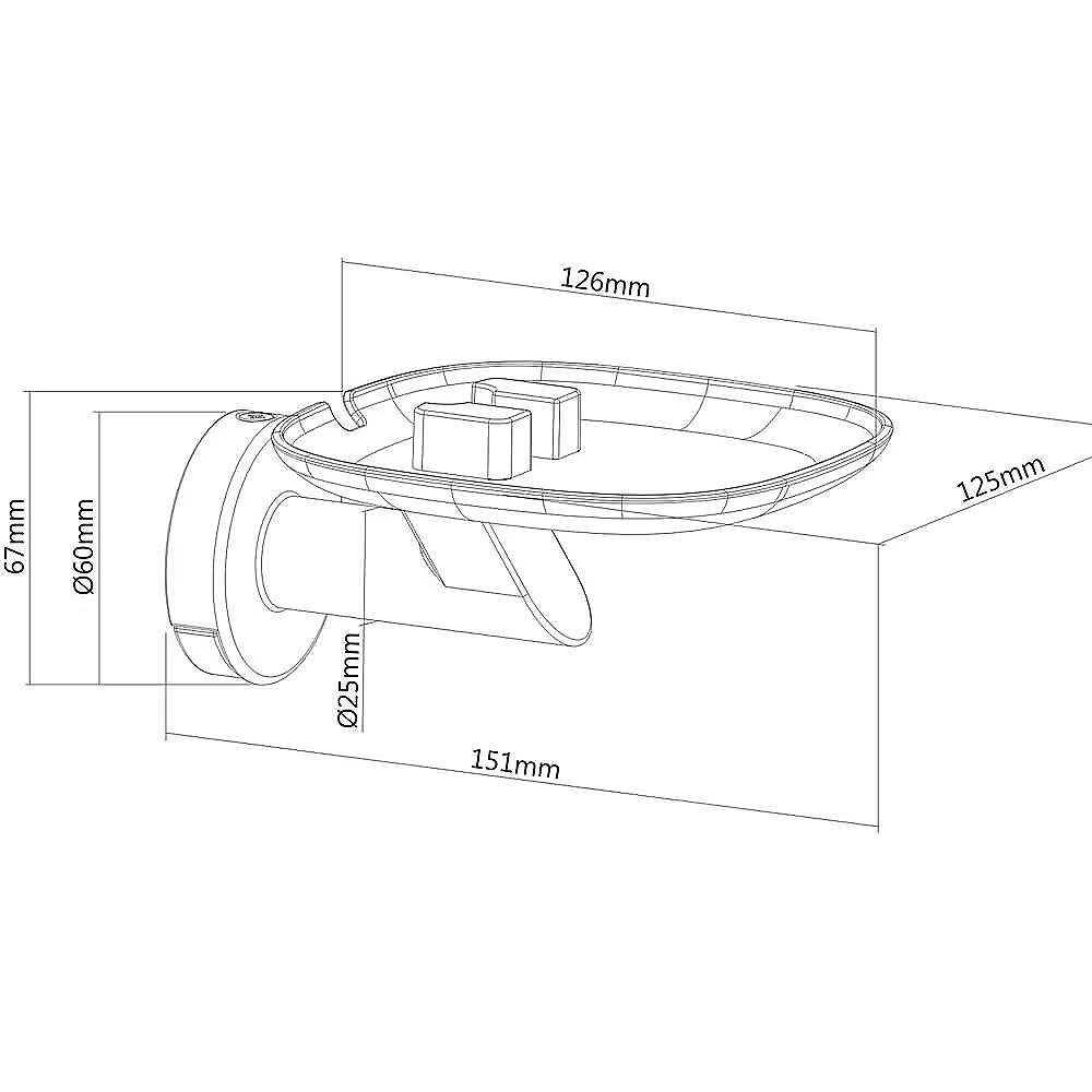 Dimensions - Base length 126 mm. Base width: 125 mm. Total length of the holder: 151 mm