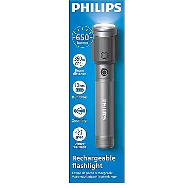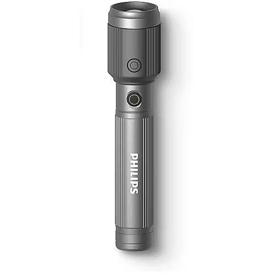 MediumDescription EN - The Philips rechargeable aluminium flashlight is a modern and water-resistant everyday torch, delivering up to 650 lumens of brightness with a beam distance of up to 350 metres. Featuring a powerful LED, up to 13 hours of runtime and convenient USB-C charging, it’s a reliable lighting solution for both indoor and outdoor use. • Brightness up to 650 lumens• Beam distance up to 350 m• IP44 water resistance• Up to 13 hours of runtime• USB-C charging• Durable aluminium body