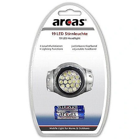 Technical details > Other features - plastic housing adjustable head strap 19 super bright LEDs 4 light functions: 3 LEDs continuous light 7 LEDs continuous light 19 LEDs continuous light 19 LEDs blinking up to 100 000 hours LED lifetime ideal for working, hiking, jogging powered by 3 x R03 batteries (incl.)