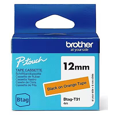 LongDesc - Brother original Btag-T31 Black on Orange 12mm tape is perfect for all-round home organisation. Create labels to organise items in the kitchen, bedroom storage, home office and personal items, as well as children’s school books and stationery.Btag tape is durable and offers resistance to many of the conditions present during everyday use in the home. Btag labels are microwave, freezer, dishwasher, household liquids and water resistant, meaning they’ll remain intact and legible over time.